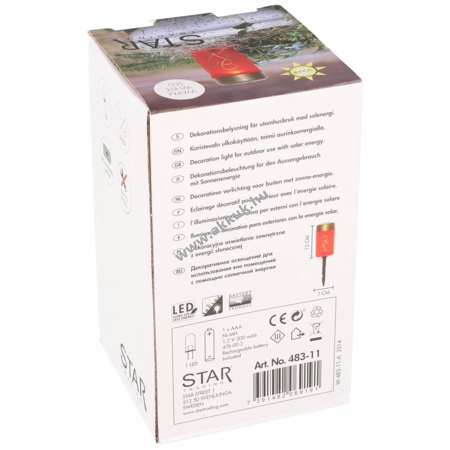 - Műszaki adatok: Modell Hearty, magasság120mmxátmérő70mm, anyag UV-álló műanyag, energiaellátás napelem