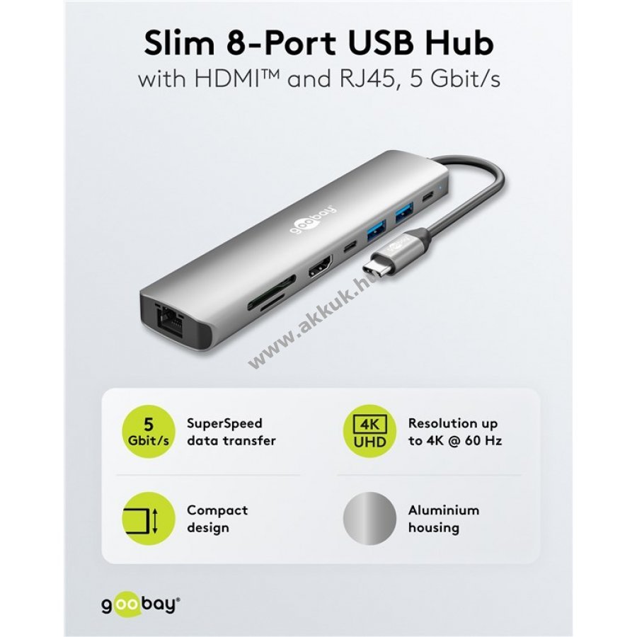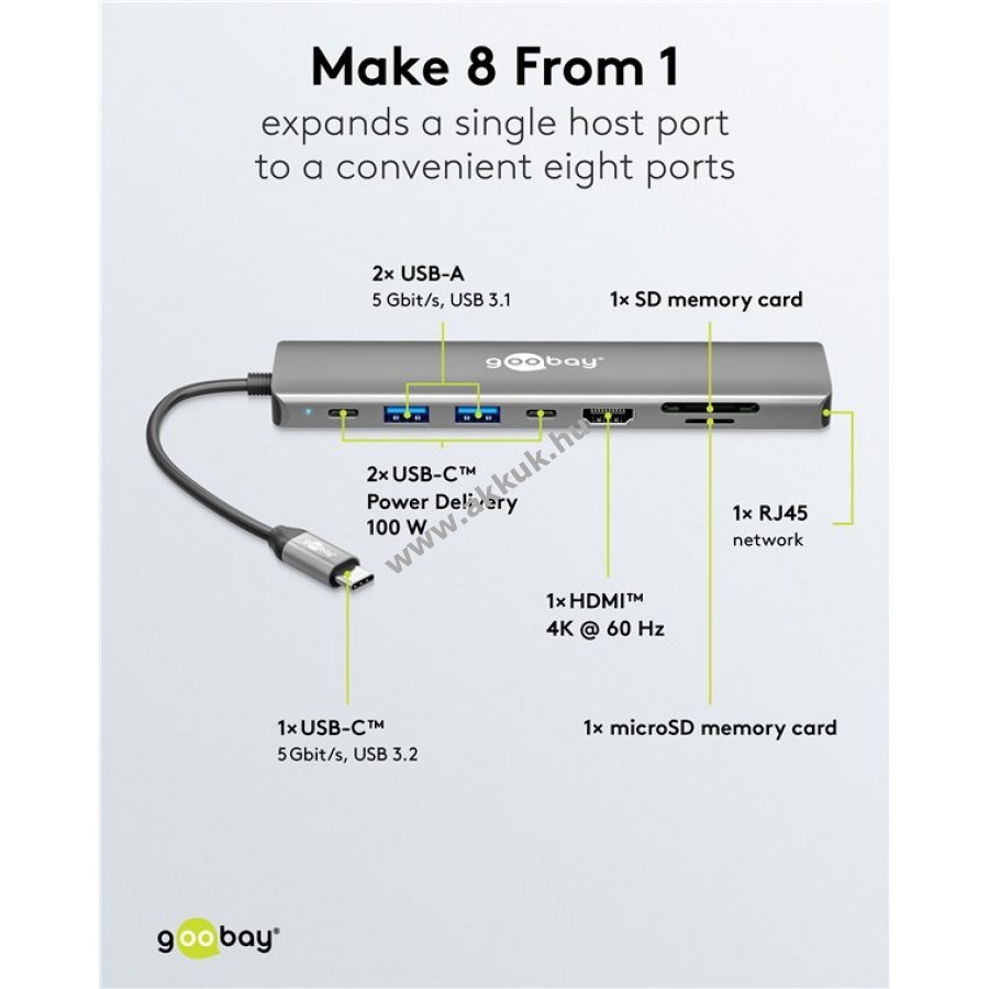 Maximális csatlakoztathatóság egyetlen USB-C porton keresztül táblagépekhez okostelefonokhoz és laptopokhoz. Egyszerűen csatlakoztathatók memóriakártyák HDMI és USB eszközök. Hasznos hálózati kábel csatlakoztatásához, ha a laptop nem rendelkezik RJ45 porttal. Gyors csatlakoztatás és stabil adatátvitel.