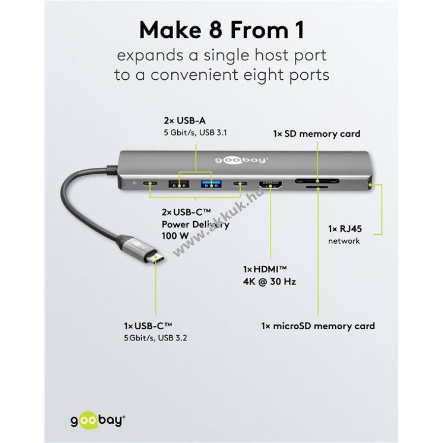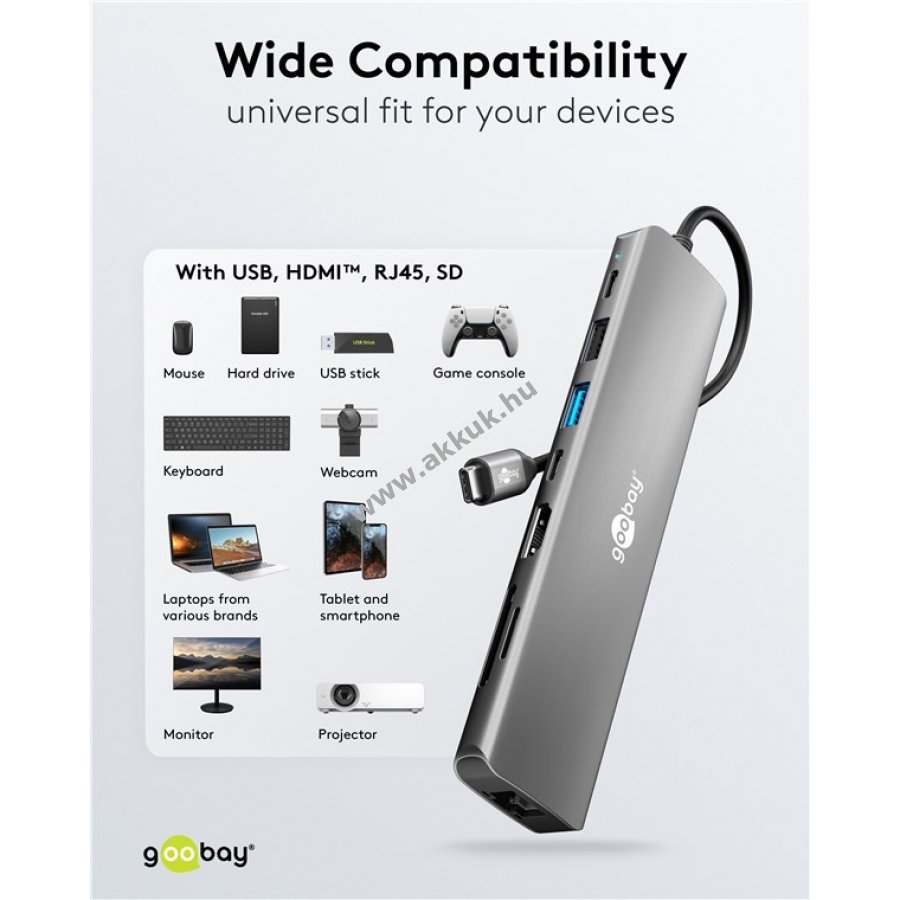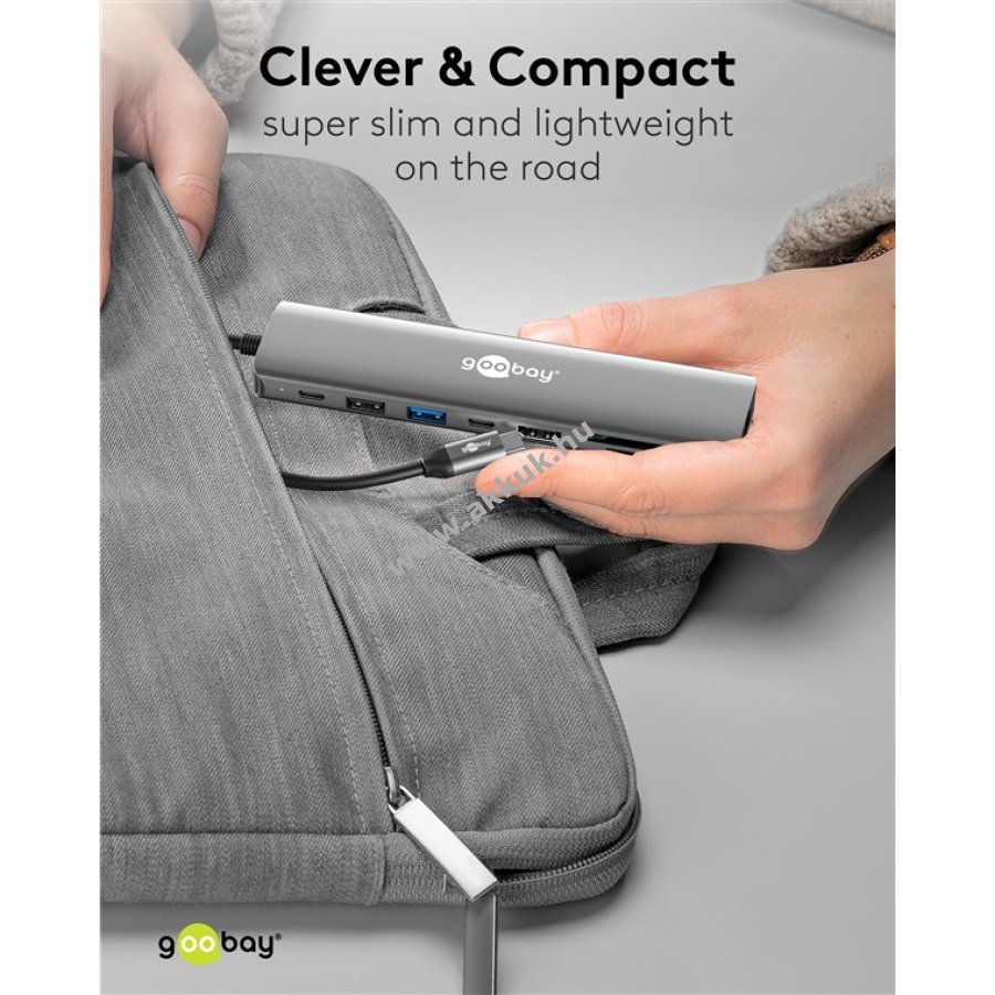 Maximális csatlakoztathatóság egy USB-C porton keresztül tabletekhez okostelefonokhoz és laptopokhoz. Egyszerűen csatlakoztathatók memóriakártyák HDMI és USB eszközök USB-C porton keresztül. Hálózati kábel csatlakoztatása RJ45 port nélkül is lehetséges így biztonságosan használható vezetékes hálózaton.