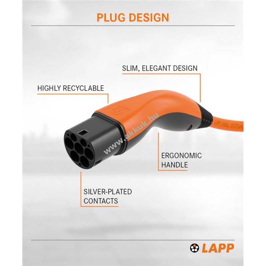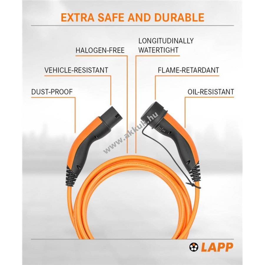 LAPP MOBILITY töltőkábel egyszerű csatlakozást biztosít elektromos és plug-in hibrid autókhoz otthoni vagy nyilvános töltőállomáson. A kábel csatlakozója az autóhoz, a dugó a töltőforráshoz csatlakozik. A töltés automatikusan indul és ér véget az autó elektronikája által. 3 fázisú kábel 22 kW teljesítményig támogatja a gyors töltést. 11 kW 3 fázisú és 7,4 kW vagy 3,7 kW 1 fázisú töltés is lehetséges. Kiválóan ellenálló, fém érintkezős csatlakozók hosszú élettartamot biztosítanak. Por, szennyeződés és víz ellen védett kupak az autóoldali csatlakozón. Olajálló, IP55 védettségű, vízálló kábel magas páratartalom mellett is használható. Üzemi hőmérséklet -40 °C és 50 °C között. Kis súlyú és kompakt kialakítású a könnyű kezelhetőségért. Mode-3 szabványnak megfelelő IEC és EN előírások szerint gyártva. Kompatibilis európai járművekkel, töltőállomásokkal és CCS Combo 2 csatlakozóval.