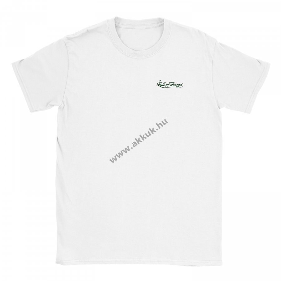 Letisztult, modern megjelenésű fehér póló finoman elhelyezett „Full of Charge” felirattal a mellrészen. A hátoldalon található akkumulátor grafika friss, energikus hangulatot ad a darabnak, miközben megmarad a minimalista összhatás.
