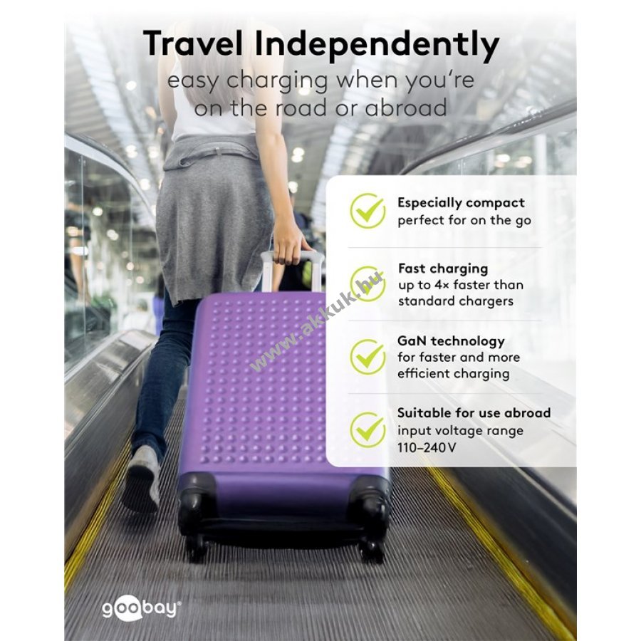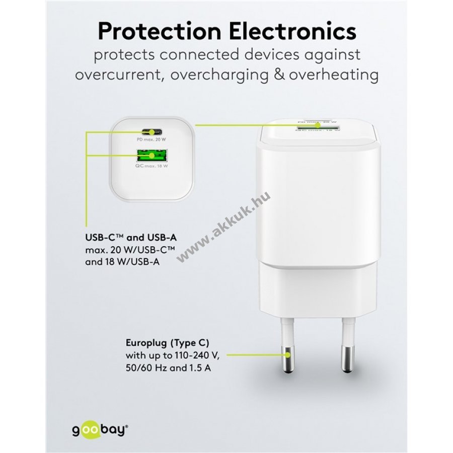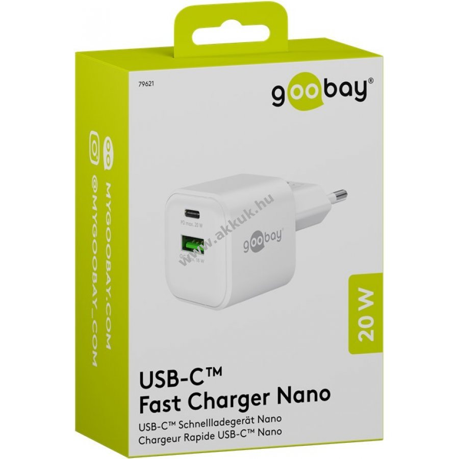 Kompakt és könnyű töltő otthoni és utazási használatra gyors és megbízható töltést biztosít okostelefonoknak és táblagépeknek. 30 perc alatt 50% töltöttség gyors töltési módban ami akár négyszer gyorsabb a szabványos töltőknél. 20W teljesítmény kis készülékekhez mint okostelefonok Bluetooth fejhallgatók táblagépek és e-könyv olvasók. Egyidejűleg két eszköz tölthető USB-C és USB-A porton keresztül. GaN félvezető technológia gyorsabb hatékonyabb töltést és kompakt kialakítást tesz lehetővé. Power Delivery és Quick Charge dinamikus és biztonságos töltési módokat kínál. Kompatibilis Apple Samsung Xiaomi LG Huawei okostelefonokkal és táblagépekkel. Beépített védelem túláram túltöltés és túlmelegedés ellen.