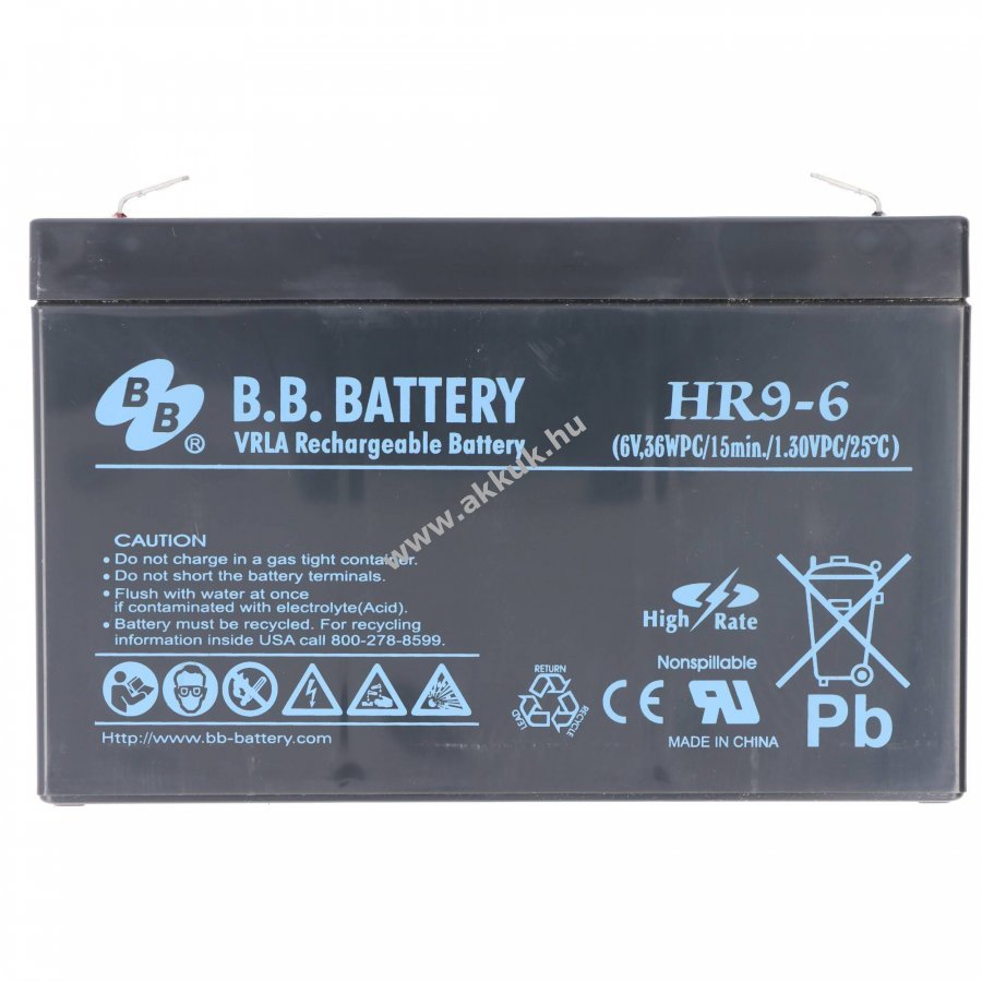 6V 9Ah SLA fekete 151mm x 34mm x 94mm 140 gr. B.B Battery 1 év jótállás (további részletek)