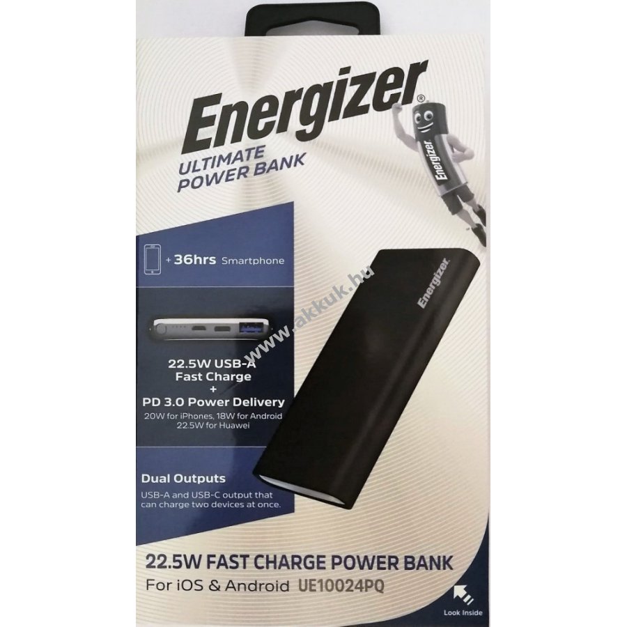 Okostelefonokhoz, táblagépekhez és egyebekhez Az Energizer UE10024PQ 10 000 mAh kapacitást biztosít kettős kimenettel, beleértve az 1 intelligens USB-A-t és 1 USB-C-t, amivel akár háromszor is feltöltheti okostelefonját. Az USB-C Power Delivery technológia lehetővé teszi az iPhone8/8 Plus/X gyorstöltését 0-ról 50%-ra mindössze 30 perc alatt. A Smart USB-A támogatja a Samsung, a Huawei és más kompatibilis Android-eszközök gyorstöltését. Az UE10024PQ a tökéletes power bank okostelefonjához, táblagépéhez és sok máshoz. Specifikáció: Cella típusa: Lítium polimer. Elem kapacitása: 10000 mAh/37Wh (Max.) Névleges bemenet: Micro USB 5V/2A 9V/2A, 12V/1,5A. Névleges bemenet: USB-C PD 5V/3A, 9V/2A 12V/1,5A. Névleges kimenet 1: USB-A 5V/3A, 9V/2A, 10V/2,25A, 12V/1,5A. Névleges kimenet 2: USB-C PD 5V/3A, 9V/2,2A, 12V/1,5A. Összes kimenet: 22,5W (Max.). Méret: 139x69x15,5 mm. Súly: 227g+-10g. Töltő kábel mellékelve.