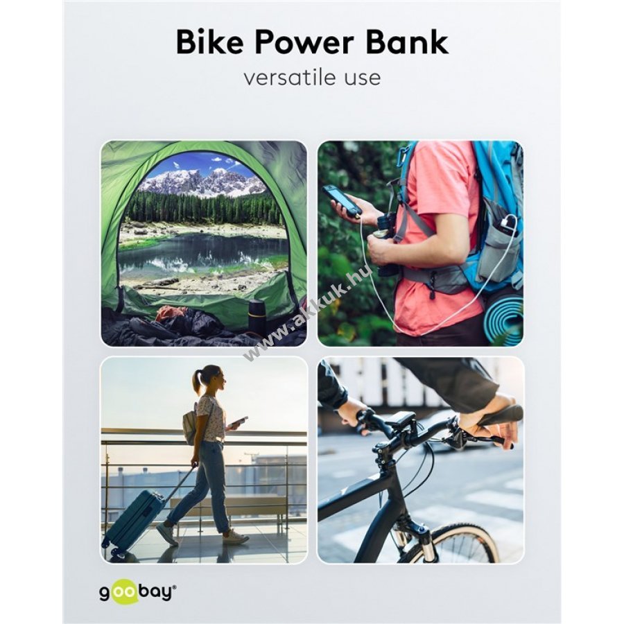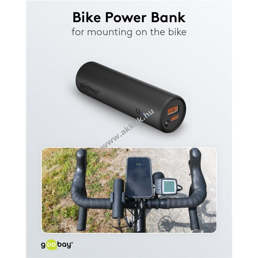 Kompakt powerbank kerékpárra szerelhető tartóval gyors töltéshez mobiltelefonhoz és kerékpárvilágításhoz. 360 fokban forgatható tartó a rugalmas rögzítéshez. Egyidejűleg két eszköz tölthető USB-A (Quick Charge) és USB-C (Power Delivery) csatlakozóval. Beépített LED zseblámpa gyalogos közlekedéshez kempingezéshez vagy utazáshoz, nem alkalmas kerékpárvilágításként és nem felel meg a német közlekedési szabályoknak. Négy LED-es töltöttségjelző mutatja az akkumulátor állapotát. Töltés USB-C bemeneten keresztül USB töltővel vagy laptopról 0,3 m USB-A USB-C kábellel.