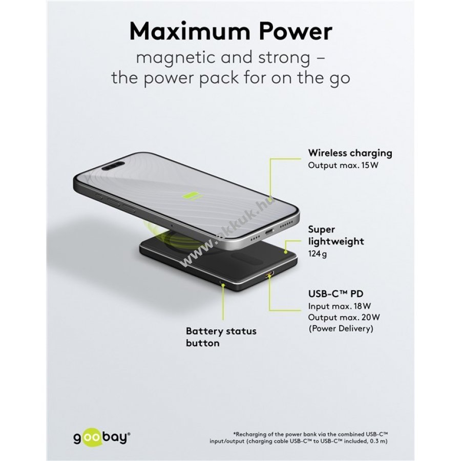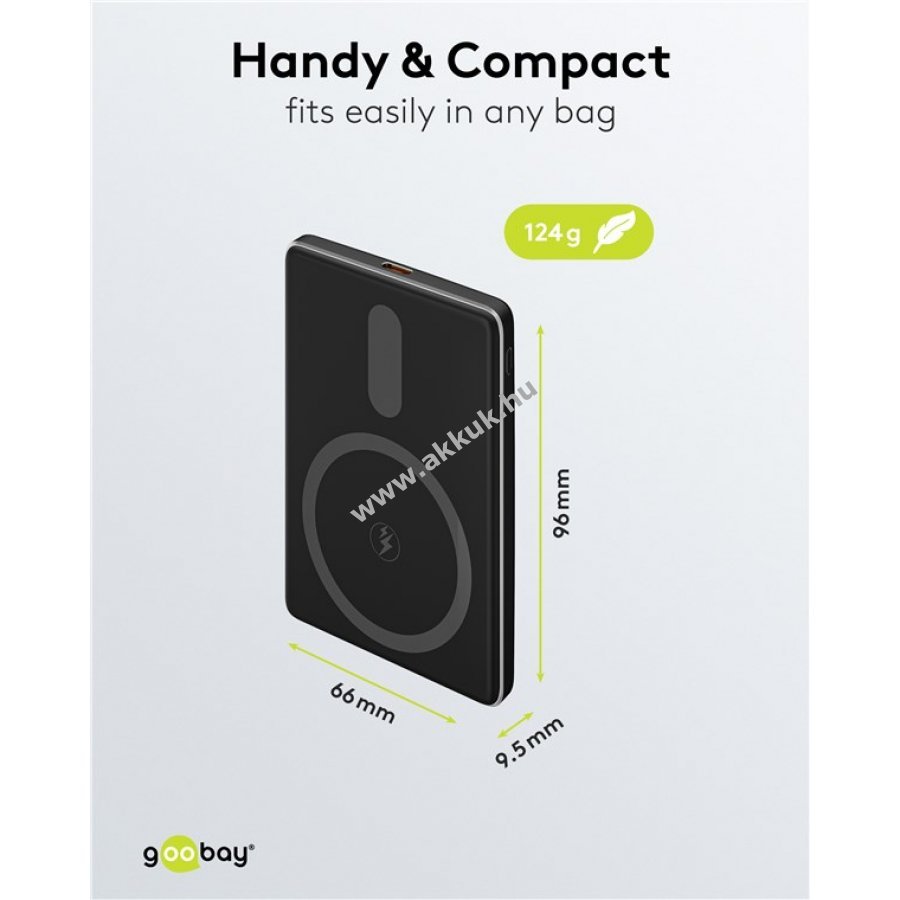 Kompakt méretű mágneses powerbank erős tapadással a telefon hátoldalán. Használat közben sem takarja el a kamerát így ideális fényképezéshez és telefonáláshoz. Kompatibilis MagSafe-képes eszközökkel, például Apple iPhone, AirPods, Google Pixel 10 és Samsung Galaxy S24 S23 S22 modellekkel. 15W-os induktív töltés okosórákhoz, fülhallgatókhoz és telefonokhoz. USB-C kimenettel 20W-os gyorstöltés vezetékes eszközökhöz. Egy teljes töltéssel egy okostelefon feltölthető. Töltése USB-C bemeneten keresztül történik, a csomagban USB-C kábel található. LED-ek jelzik az akkumulátor töltöttségét.