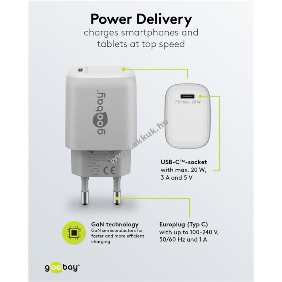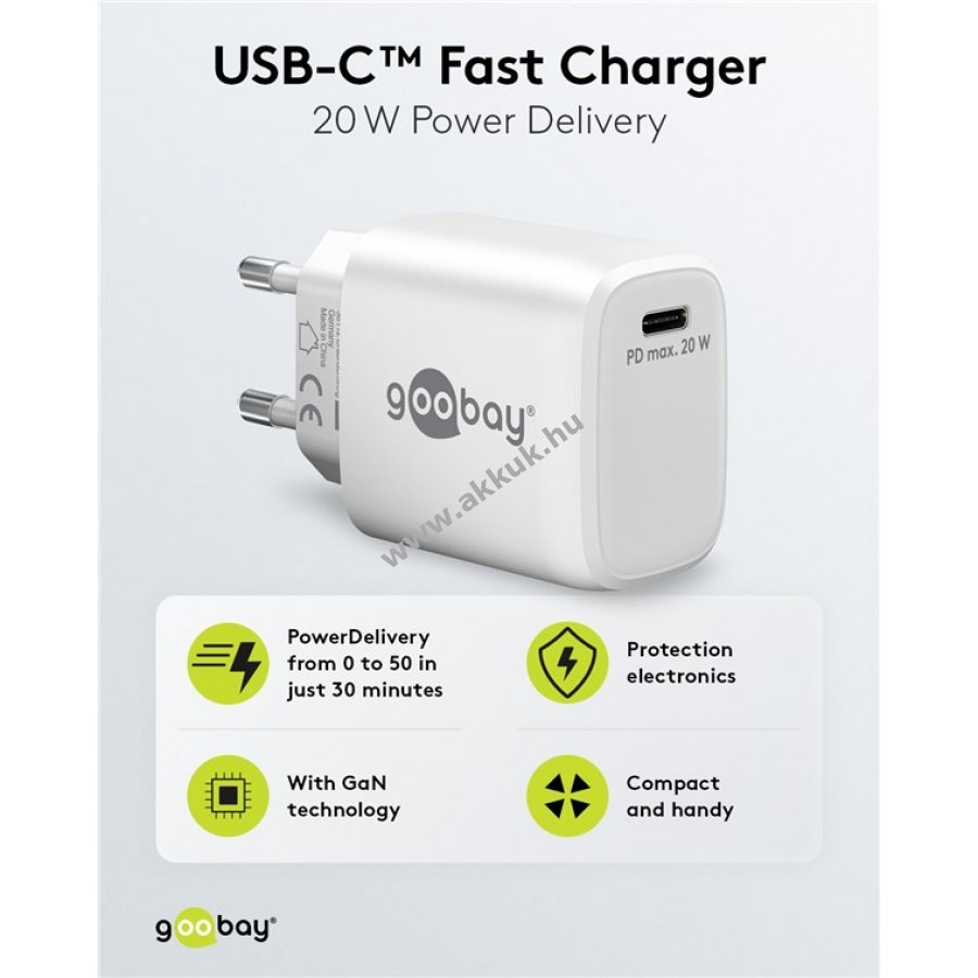 Kompakt gyorstöltő univerzális USB-C csatlakozóval okostelefonokhoz és táblagépekhez. 50% töltés 30 perc alatt a gyors töltési módnak köszönhetően akár négyszer gyorsabb a hagyományos töltőknél. 20 W teljesítmény ideális kisebb eszközökhöz, mint okostelefon, Bluetooth fejhallgató, tablet vagy powerbank. Kis méret és könnyű kialakítás utazáshoz is praktikus. GaN technológiás félvezetők gyorsabb és hatékonyabb töltést, valamint kisebb méretet biztosítanak. Power Delivery 3.0 biztonságos és dinamikus töltést garantál az eszköz optimális teljesítményével. Egyszerű dizájn lekerekített élekkel és sima felülettel. Kompatibilis Apple iPhone, Samsung, Xiaomi, LG, Huawei okostelefonokkal és Apple iPad, Samsung Galaxy táblagépekkel. Beépített védelem túlfeszültség, túláram és túlmelegedés ellen.