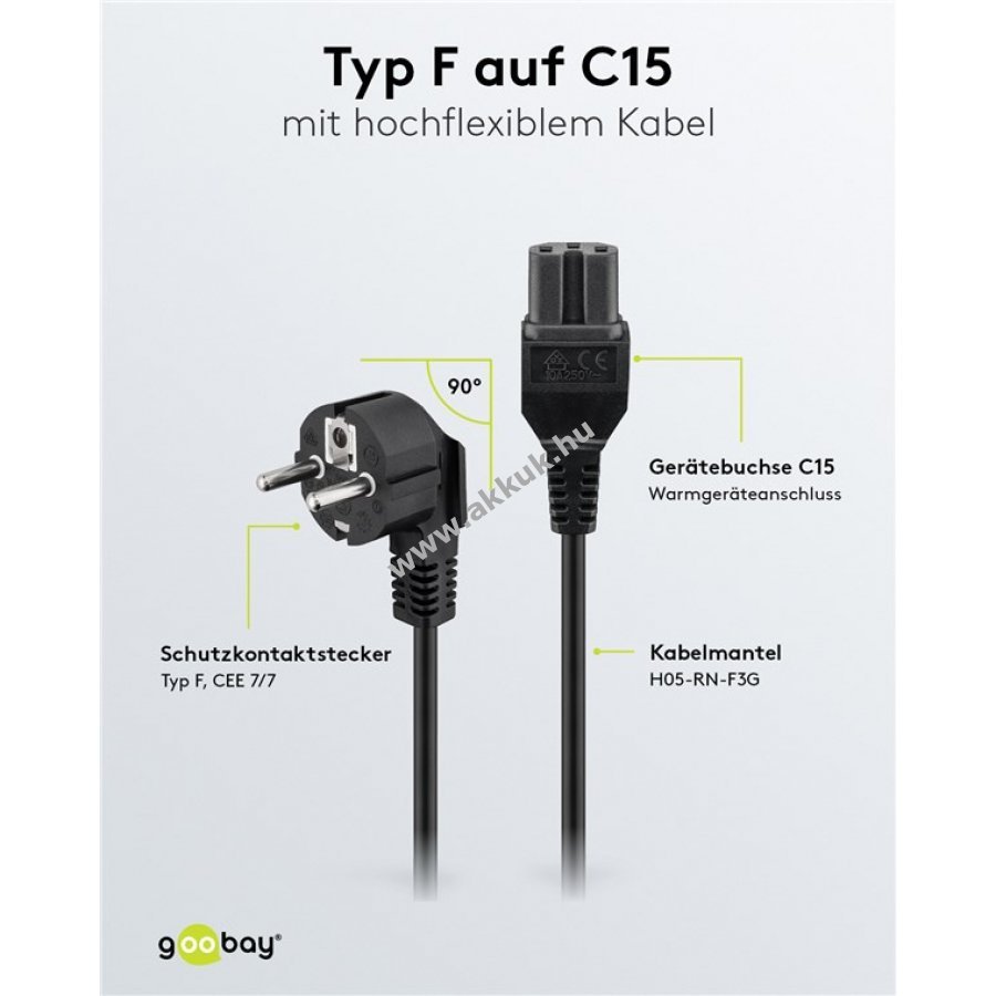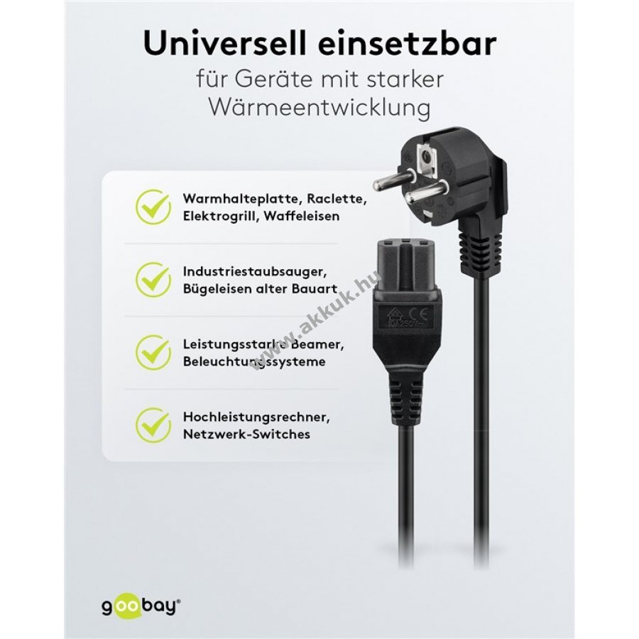 Univerzális hálózati kábel melegítő készülékhez fém érintkezős csatlakozóval és védőérintkezős dugóval. Alkalmas melegentartó lapokhoz, asztali grillekhez, vasalókhoz, gofrisütőkhöz és egyéb C16 csatlakozóval rendelkező készülékekhez. Ideális használt melegítő készülék kábel cseréjéhez.