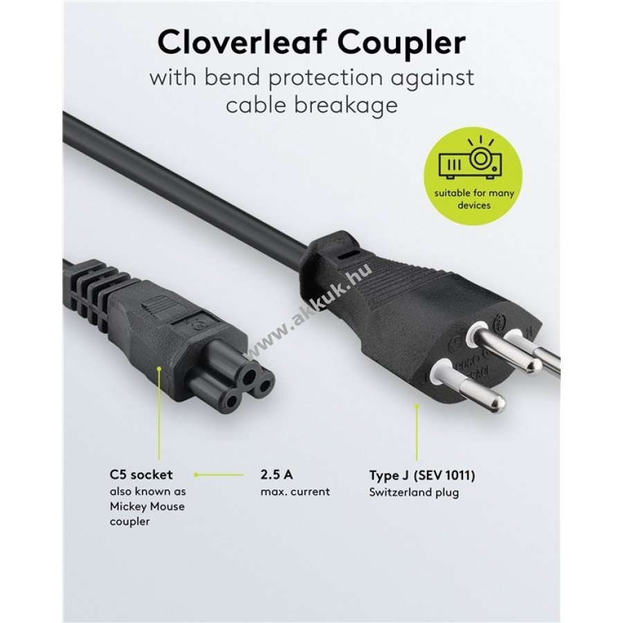 Tápkábel Svájci dugóval (Typ J SEV 1011) és IEC-60320-C5 csatlakozóval. Alkalmas monitorok, szkennerek, projektorok, nyomtatók és hangszórók csatlakoztatására. Ideális használt tápkábel cseréjéhez.