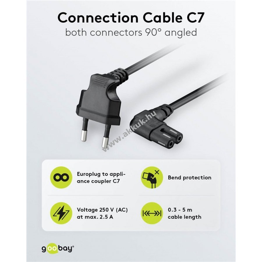 Cserekábel hibás tápkábelekhez rádióhoz sztereóhoz vevőhöz játékkonzolhoz kávéfőzőhöz Tévéhez notebook tápegységhez kazettás magnóhoz laptophoz lapos képernyőhöz borotvához Használható PlayStation 3 4 5-höz Xbox One és Xbox One X-hez 90 fokban elfordított csatlakozó a helytakarékos elhelyezéshez szűk helyen 2 pólusú tápkábel kisgépekhez max 2 5 A terhelhetőségű földelés nélküli készülékekhez Rugalmas PVC vezeték (H03VV-H2-F) könnyű mechanikai igénybevételhez semleges fekete színű