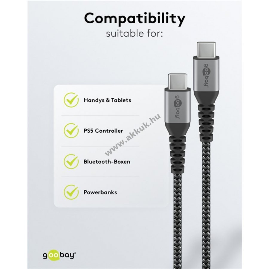 Elegáns és extra strapabíró USB-C-kábel textilborítással és matt ezüst alumínium csatlakozókkal. Megbízható áramellátást és gyors adatátvitelt biztosít minden USB-C eszköz között. Kiváló okostelefonokhoz, kamerákhoz, fejhallgatókhoz, okosórákhoz és táblagépekhez. 60 W teljesítményű gyors töltés. 480 Mbit/s adatátviteli sebesség USB 2.0 szerint. Megerősített fém csatlakozók és textilborítás a hosszú élettartamért. Kellemes tapintású fonott textilkábel, kíméletes a felületekhez. 1 m hosszúság kényelmes használatot biztosít. Univerzálisan kompatibilis okostelefonokkal, Apple iPhone-nal, PC-vel, laptopokkal, táblagépekkel, támogatja az Apple MacBook töltést.