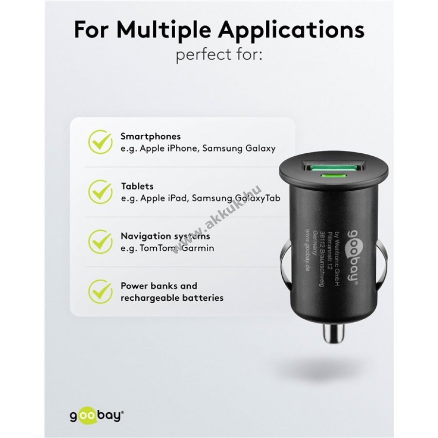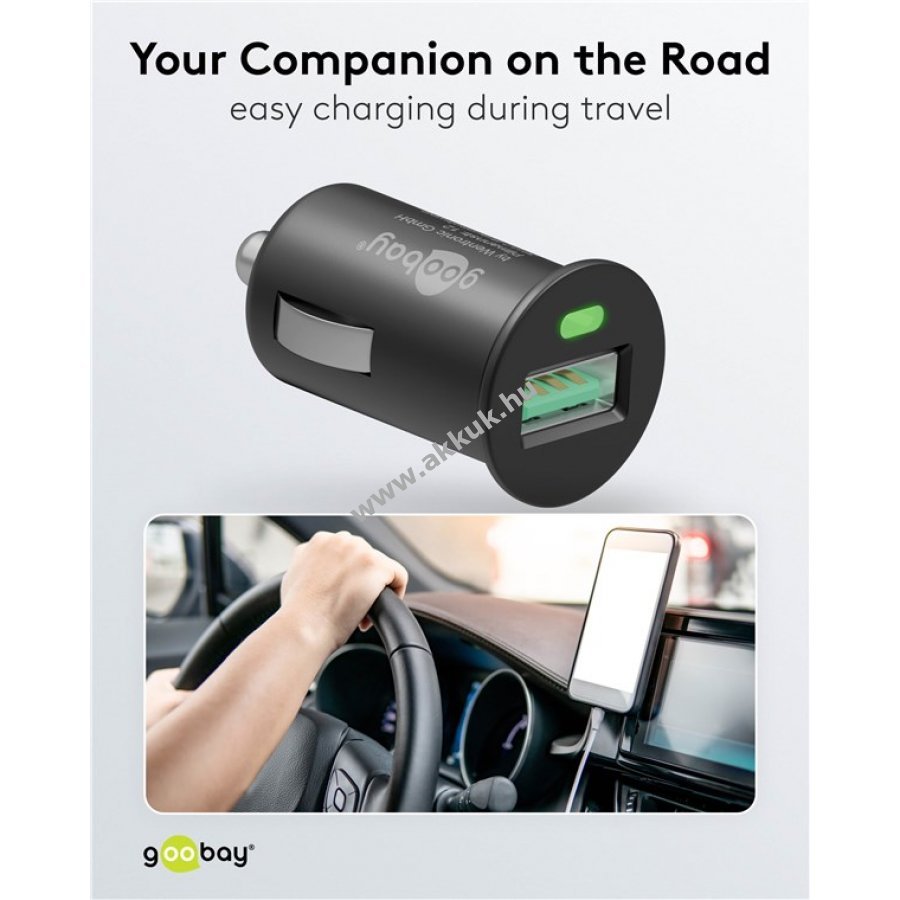 A Goobay USB-autós töltővel telefonok, kamerák, fejhallgatók, okosórák, tabletek és egyéb eszközök tölthetők. A kompakt adapter közvetlenül a szivargyújtó aljzatba csatlakoztatható. Gyors és zavartalan töltést biztosít USB-eszközök számára.