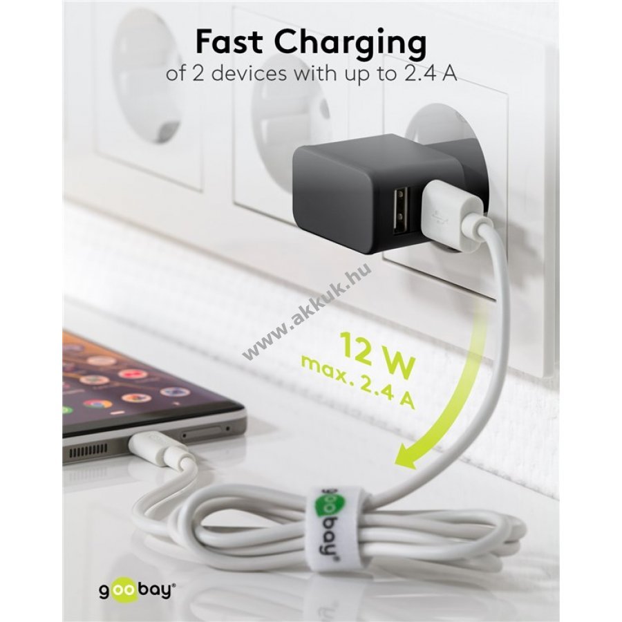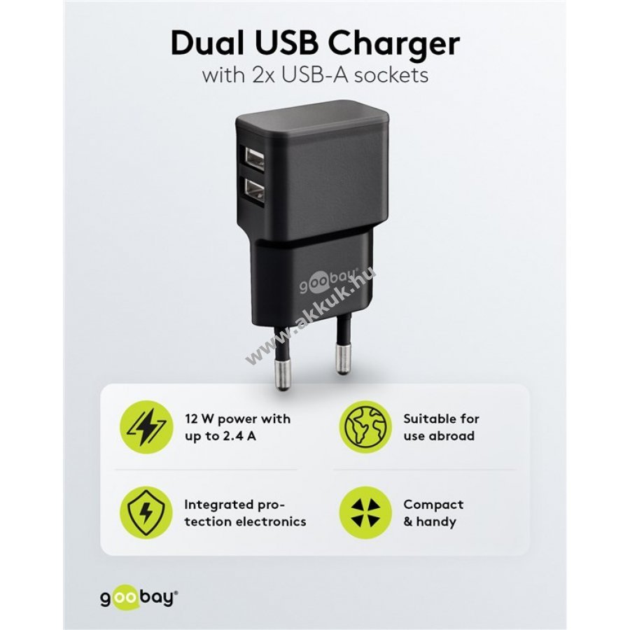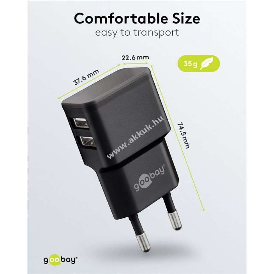 Kompakt és rugalmas töltő két USB-A csatlakozóval egyszerre két eszköz töltéséhez otthon és útközben 12W teljesítménnyel kis eszközökhöz mint okostelefonok okosórák vagy Bluetooth fejhallgatók
