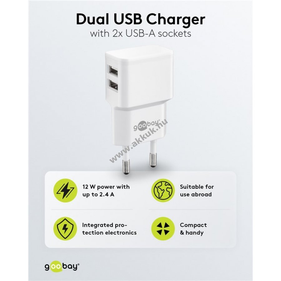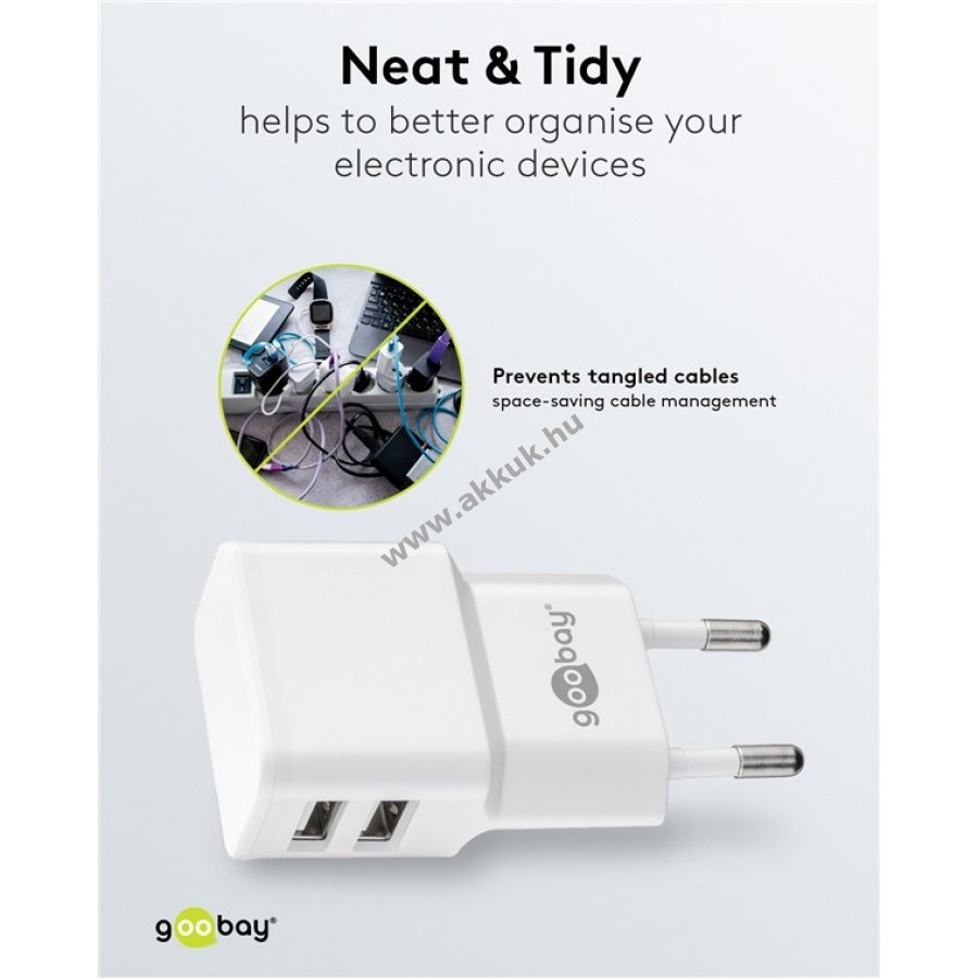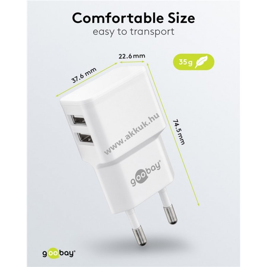Két USB-A csatlakozóval egyszerre két eszköz tölthető gyorsan és kényelmesen. Kompakt és könnyű kialakításának köszönhetően ideális otthoni és utazási használatra. 12W teljesítményével elsősorban okostelefonok, okosórák és vezeték nélküli fejhallgatók töltésére alkalmas.