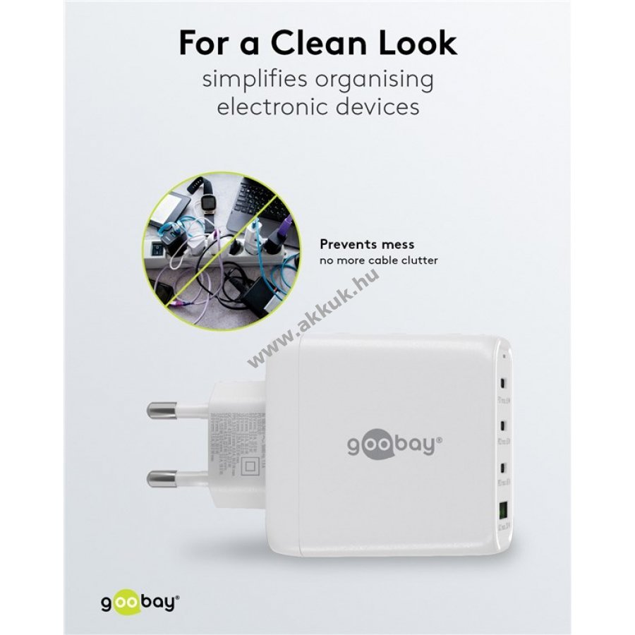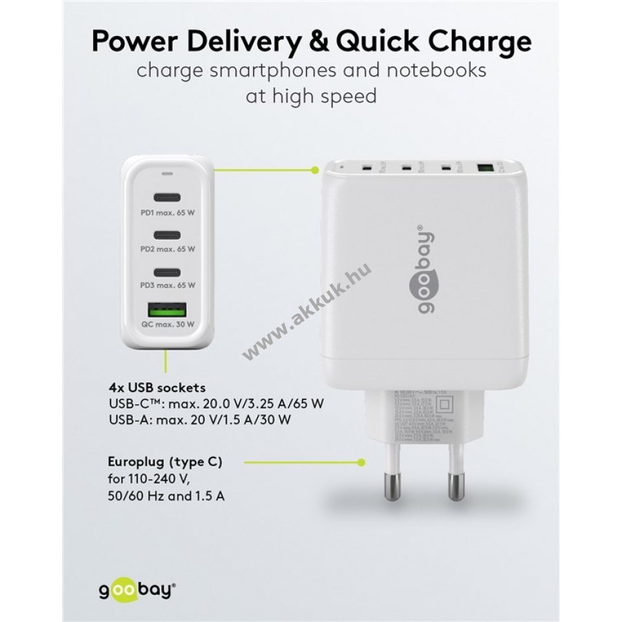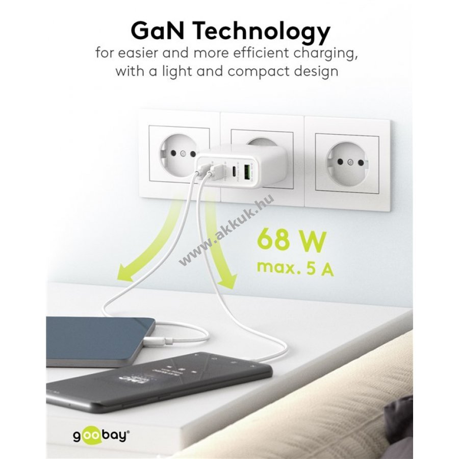 Kompakt és energiatakarékos GaN technológiás töltő 68W maximális teljesítménnyel. 3 USB-C és 1 USB-A csatlakozóval egyszerre négy eszköz tölthető gyorsan és biztonságosan.