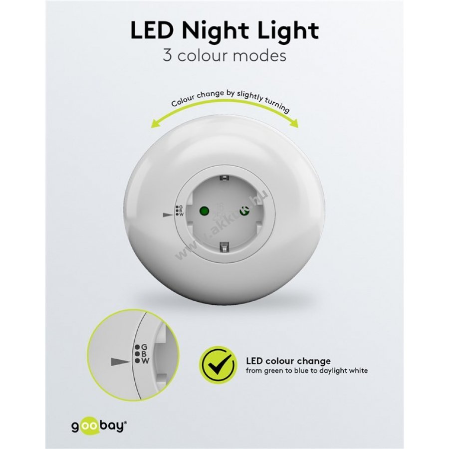 Energiatakarékos LED éjszakai fény 9 LED-del és fényérzékelővel amely 21 lx alatt automatikusan bekapcsol. 3 színmód: külső gyűrű enyhe elfordításával vált zöld kék és nappali fehér között 6500 K 0,5 W 6 lm. Kiváló tájékozódó fényként és diszkrét csíkmentes világításra folyosón fürdőszobában hálószobában gyerekszobában pincében vagy lépcsőn. Átmenő dugaljként további 250 V AC 16 A max 3680 W készülék csatlakoztatható ugyanarra a dugaljra. Kompakt mérete 82 x 82 x 72 mm nem takarja el a szomszédos dugaljakat. Fokozott érintésvédelem a biztonság érdekében. Masszív műanyagból készült IP20 védelemmel csak beltéri használatra.