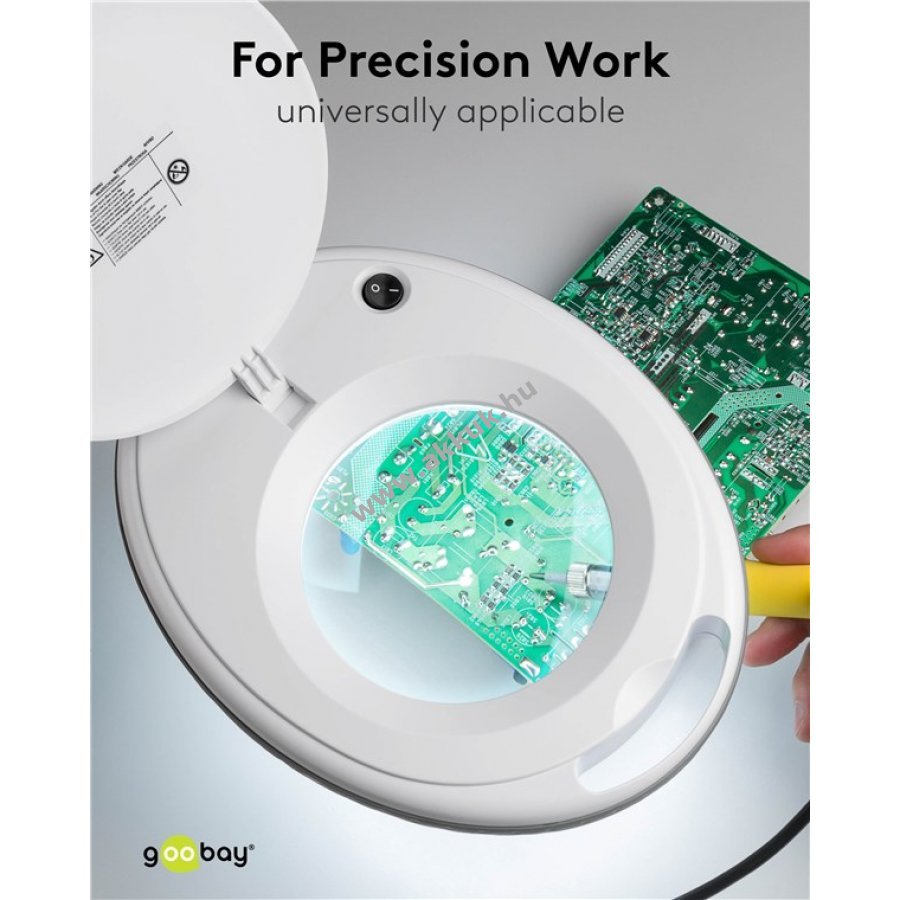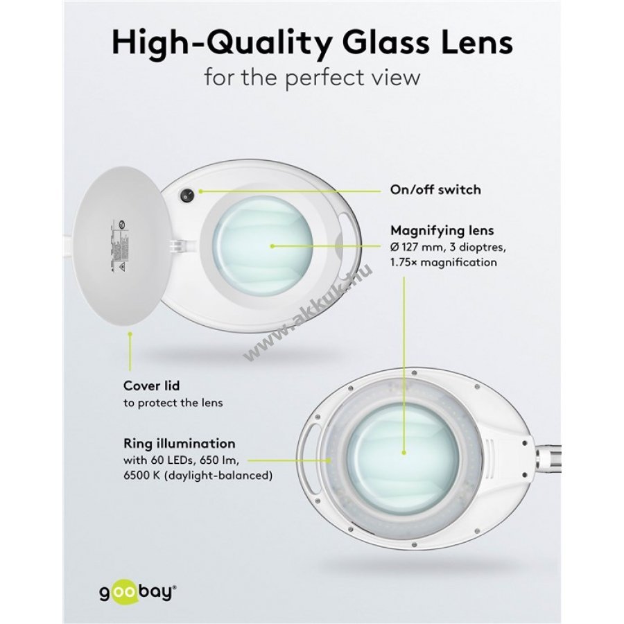 Nagyítólámpa 127 mm átmérőjű üveglencsével és árnyékmentes nappali fehér LED gyűrűvilágítással 8W teljesítménnyel 650 lumen fényerővel 3 dioptriával és 1,75-szörös nagyítással nem cserélhető lencsével 700 mm-es munkatartományt biztosító dupla ízületes kar rugalmas elhelyezéshez a nagyítólámpa feje 90°-ban dönthető és 360°-ban forgatható univerzális használat kozmetikában olvasáshoz vagy precíziós munkákhoz mint például forrasztás és kézműves tevékenységek alkalmas íróasztali nagyítónak és olvasó vagy rajzoló lámpának az asztalra szerelhető tartó maximum 60 mm vastag asztallaphoz megfelelő pótasztali bilincs 77460 falitartó 55771