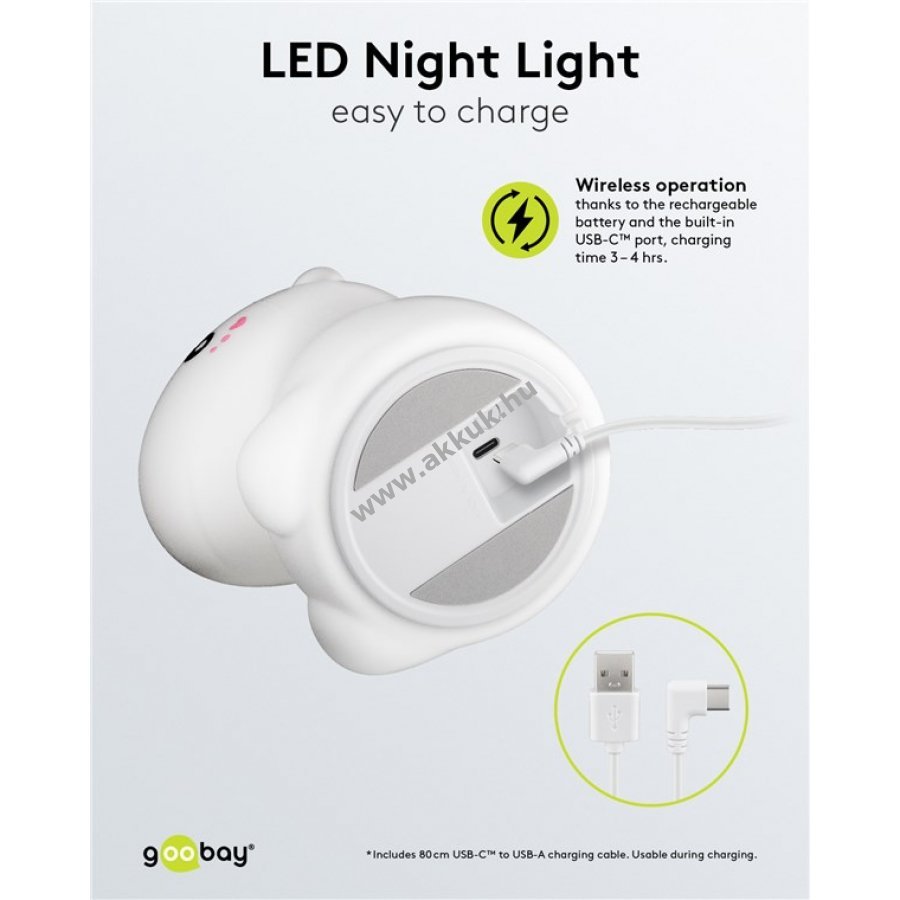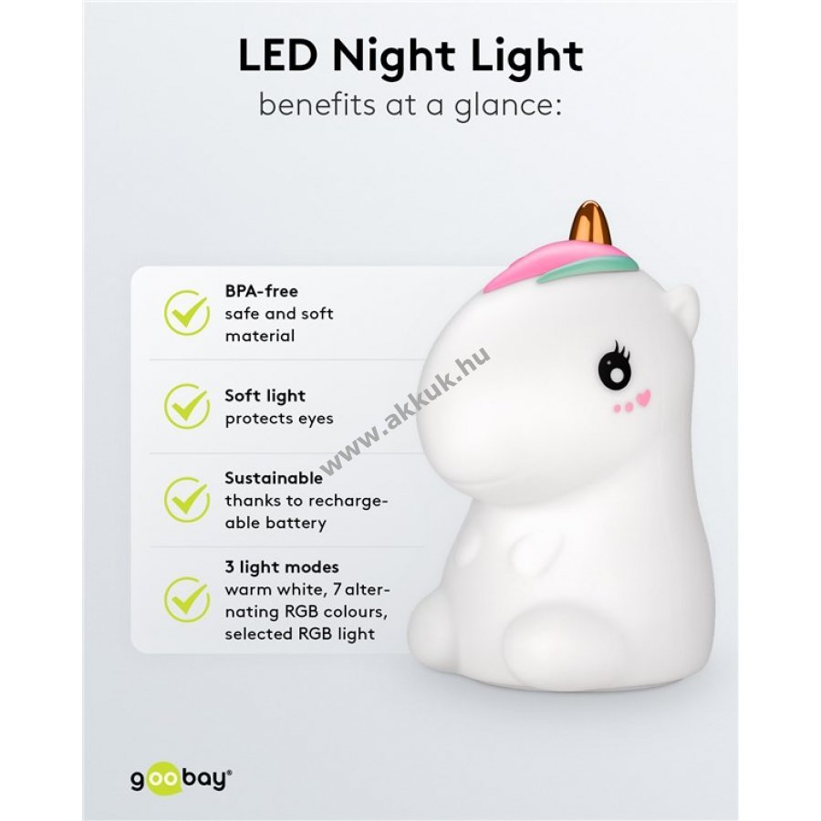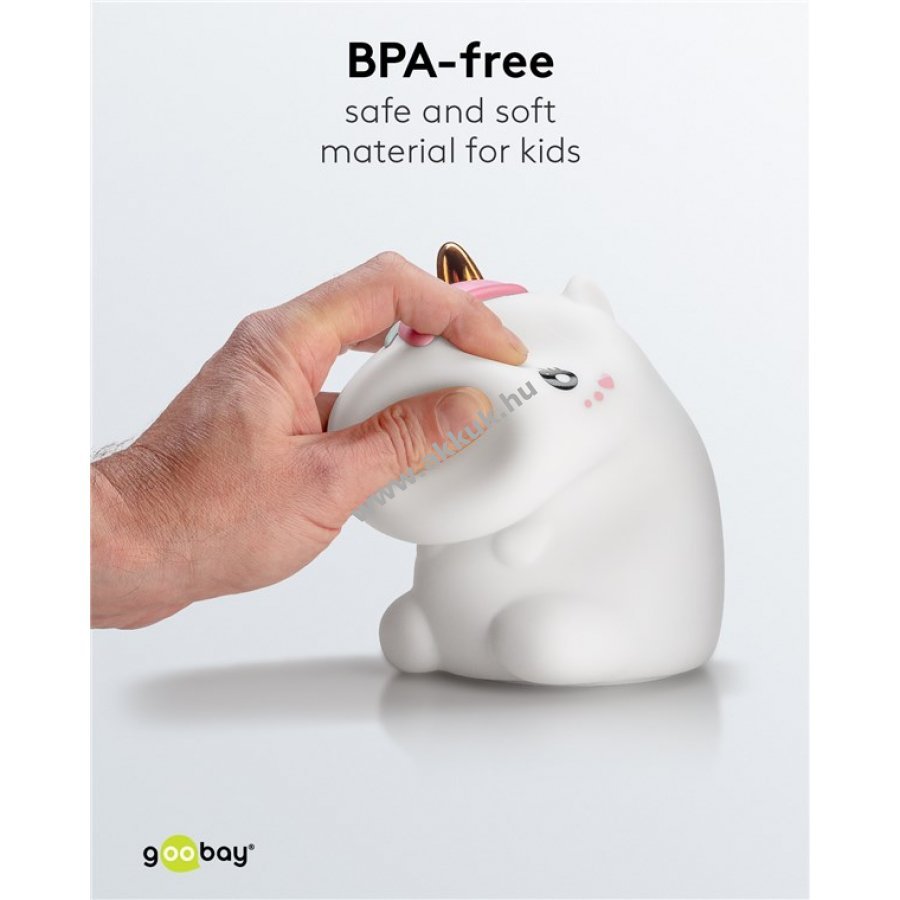 Színes hordozható éjszakai lámpa gyerekeknek BPA-mentes anyagból ideális utazáshoz és éjszakai használatra. Puha LED-fény harmonikus hangulatot teremt hálószobában és gyerekszobában. 3 világítási mód: melegfehér fény, lágy 7 színű színváltás, folyamatosan világító kiválasztott RGB szín. Érintésérzékeny vezérlés a rugalmas LED lámpán koppintással a módok közötti váltáshoz. Vezeték nélküli működés újratölthető Li-Ion akkumulátorral USB-C csatlakozóval és 80 cm-es USB-C-USB-A töltőkábellel. Töltési feszültség 5V 1A. Működési idő RGB fény esetén 9 óra melegfehér fény esetén 10 óra. Töltési idő 3-4 óra.