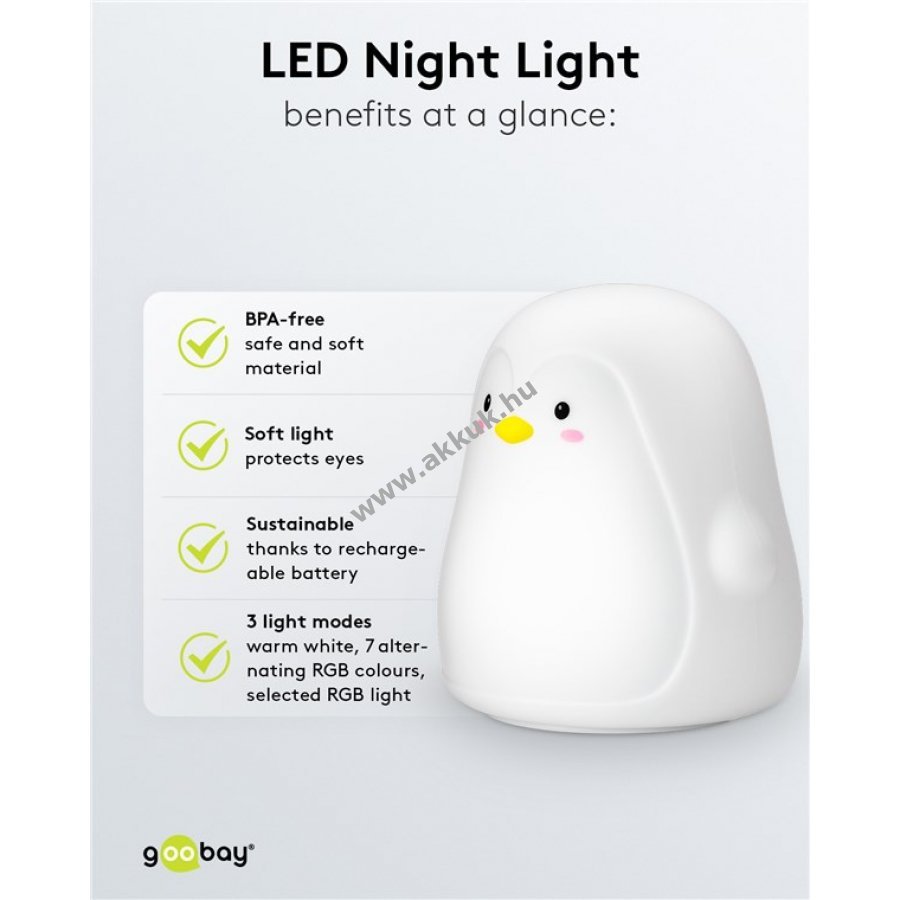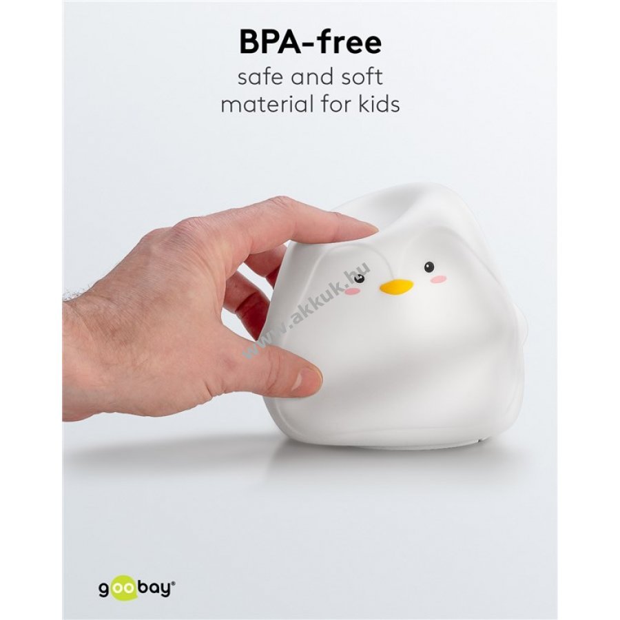 Színes hordozható éjszakai lámpa gyerekeknek BPA-mentes anyagból ideális utazáshoz és éjszakai használatra. Puha LED fény nyugtató légkört teremt hálószobában és babaszobában. 3 világítási mód: meleg fehér fény, 7 színű lágy váltakozás, folyamatosan világító kiválasztott RGB szín. Érintésérzékelős vezérlés rugalmas lámpatesttel a világítási módok közti váltáshoz. Vezeték nélküli működés újratölthető Li-Ion akkumulátorral USB-C csatlakozón keresztül 80 cm-es töltőkábellel. Töltés 5 V 1 A, működési idő RGB fénnyel 9 óra, meleg fehér fénnyel 10 óra, töltési idő 3-4 óra.