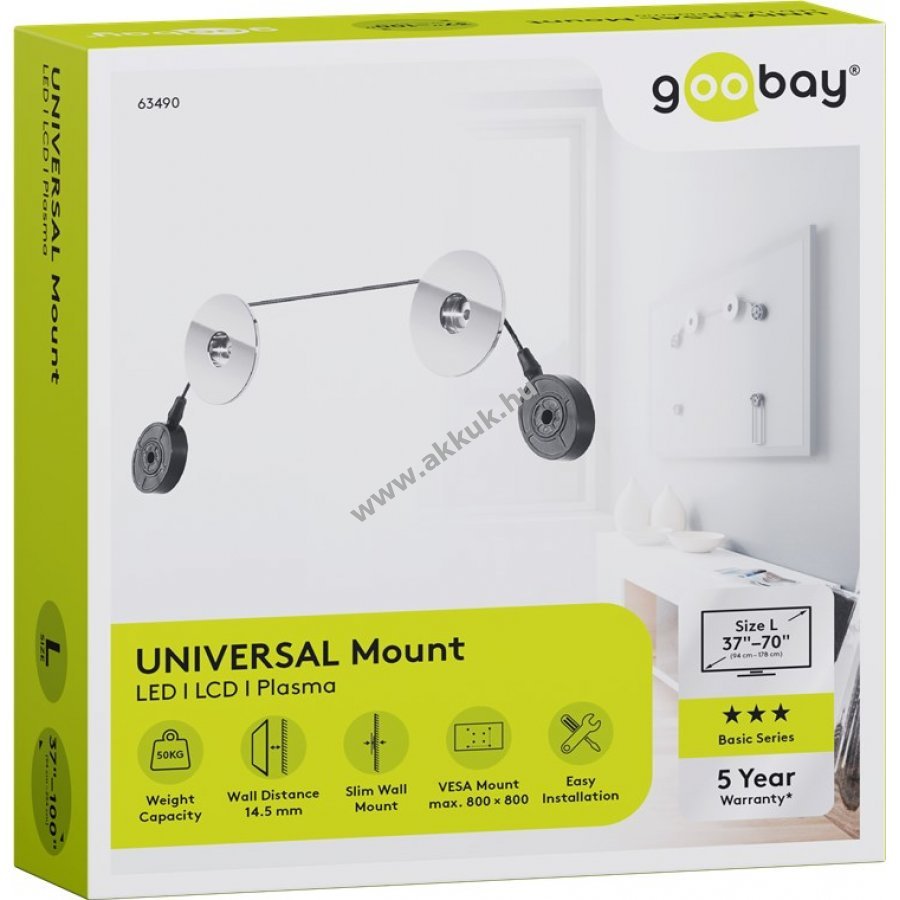 Innovatív állítható kábelrögzítés univerzális lyukmintával a legtöbb 37-70 hüvelykes televízióhoz és 50 kg-ig. Egyszerű felszerelés képként való felakasztással. Ultrakompakt falitartó csak 14,5 mm távolságra a faltól kiemeli az ultravékony képernyők eleganciáját. Nagyfokú rugalmasság és univerzális használat. Kompatibilis a legtöbb ívelt és síkképernyős televízióval, például Samsung QLED és LED, Sony, Philips, LG modellekkel. Támogatja a VESA 800x800 mm-es szabványt és az ennél kisebb méreteket.
