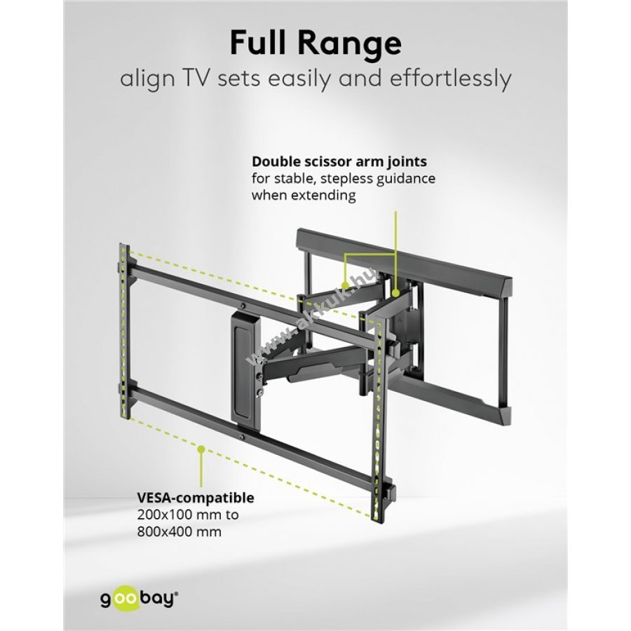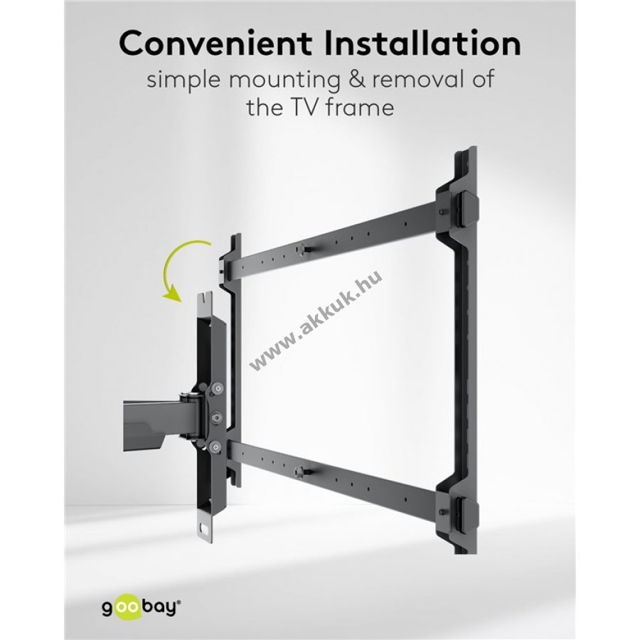 Nagy teherbírású fali konzol akár 60 kg súlyú TV-khez és monitorokhoz. Teljes mozgathatóság és egyszerű beállítás a megfelelő nézőszög eléréséhez bármely helyiségből.