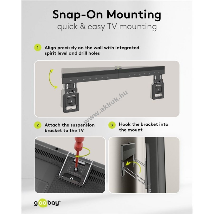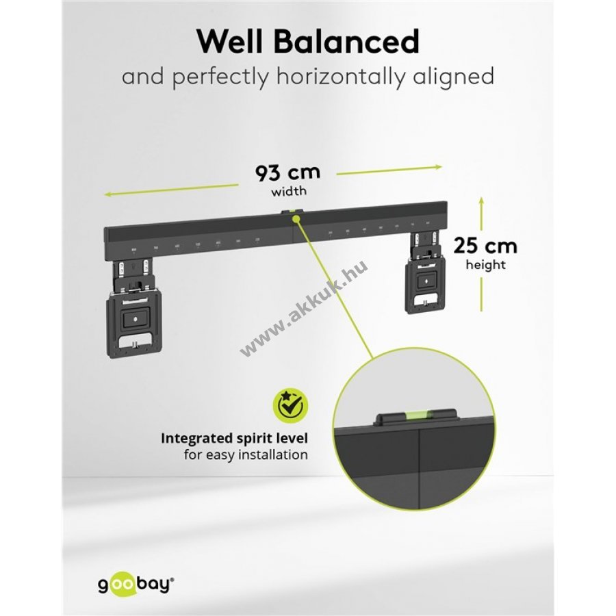 VESA kompatibilis távolságjelölések és beépített vízmérték segíti a pontos beállítást.