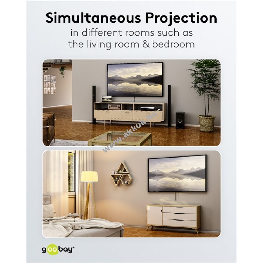 Audio és videó jeleket párhuzamosan továbbít a csatlakoztatott eszközökre például több helyiségben történő egyidejű vetítéshez.