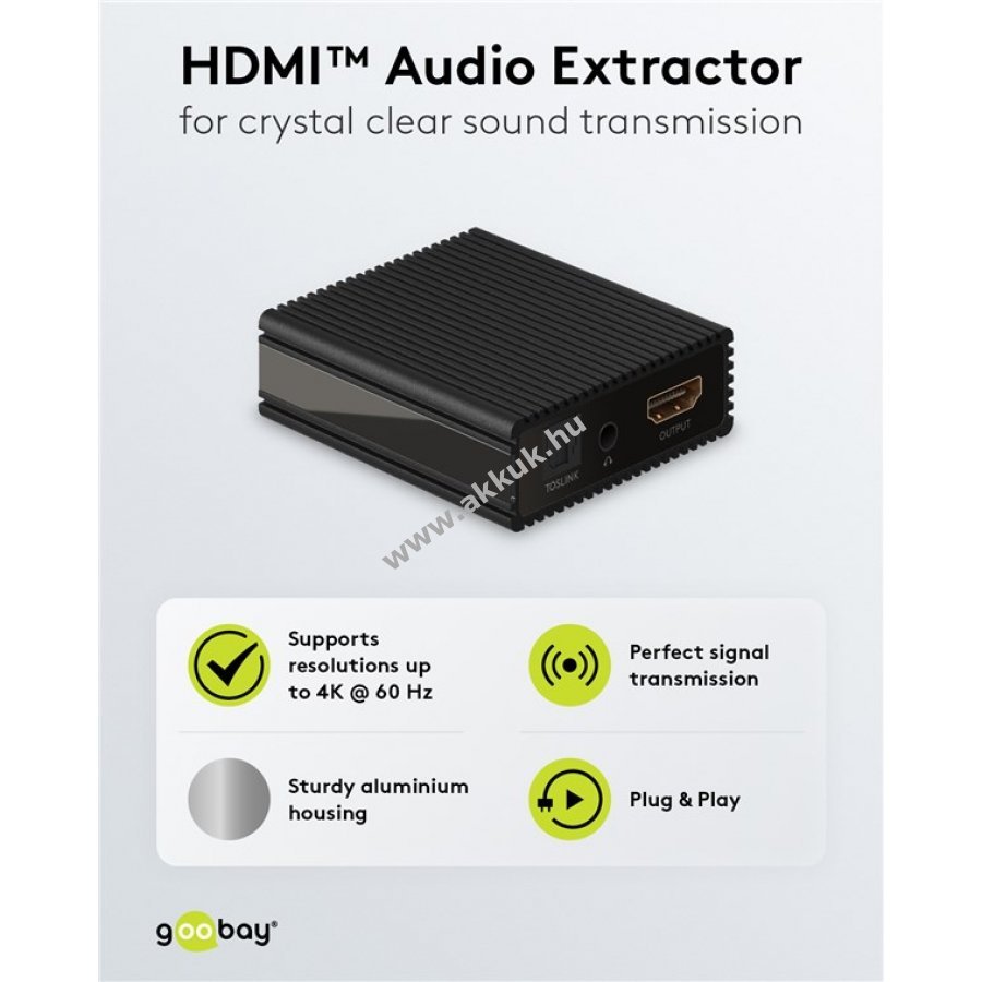 Digitális HDMI hangjelet alakít át analóg sztereó jellé Hi-Fi rendszerekhez vagy soundbarokhoz. 4K2K @ 60 Hz videóátvitel HDMI kimeneten 3D támogatással. Kompakt alumínium ház hőelvezetéssel és aranyozott csatlakozókkal a kiváló jelátvitelért. Egyszerű plug & play használat telepítés nélkül. Ideális HDMI nélküli eszközökhöz, például fejhallgatókhoz vagy TV-khez.
