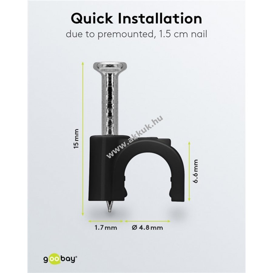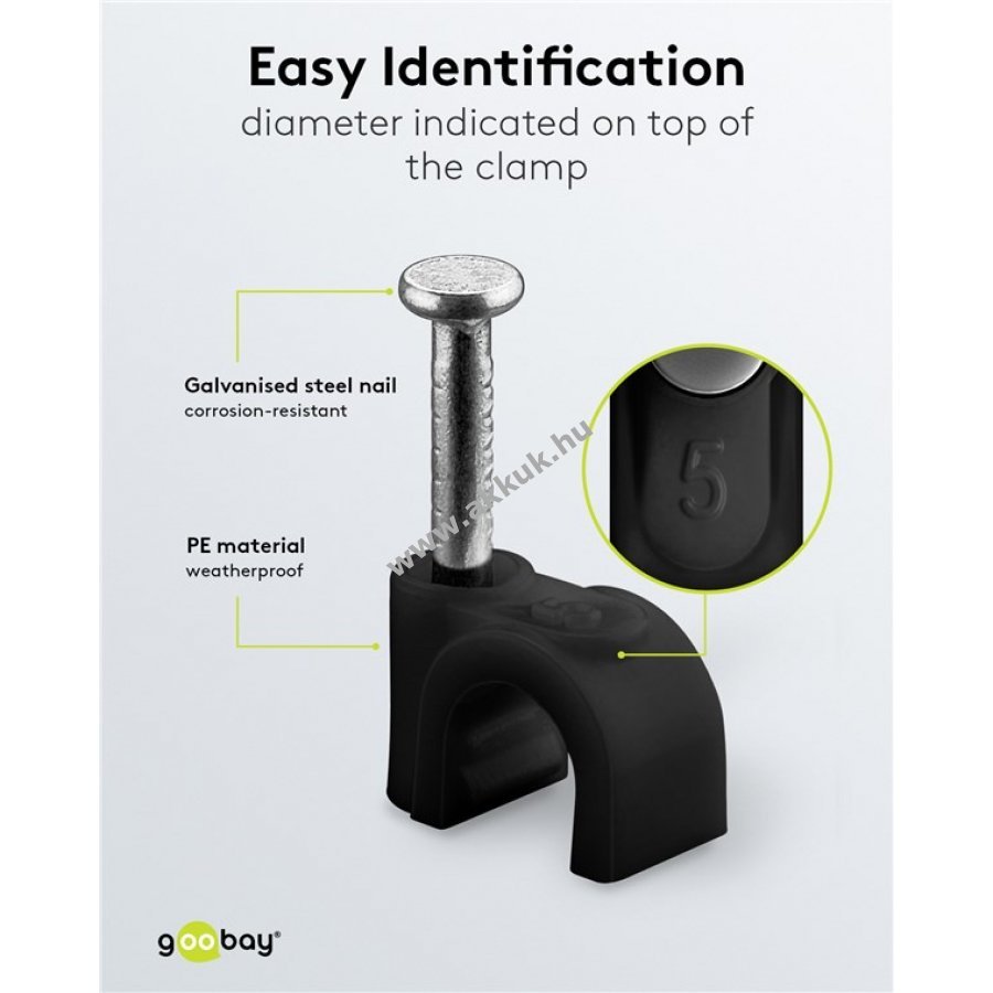 Kábelrendező bilincs kábelek rögzítéséhez falon ajtókereten és sarkokban. Stabilizált PE műanyagból és horganyzott acél szeggel készült. Használható beltéren és kültéren egyaránt. Jó szigetelésű korrózió- és öregedésálló.