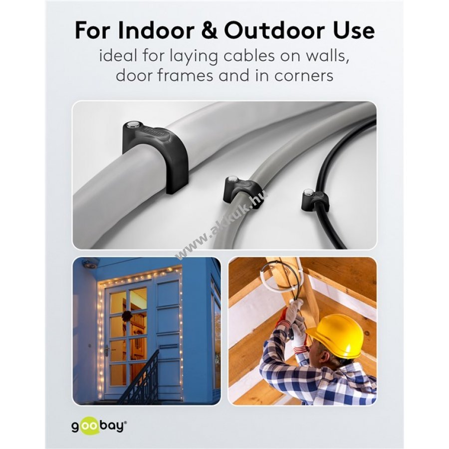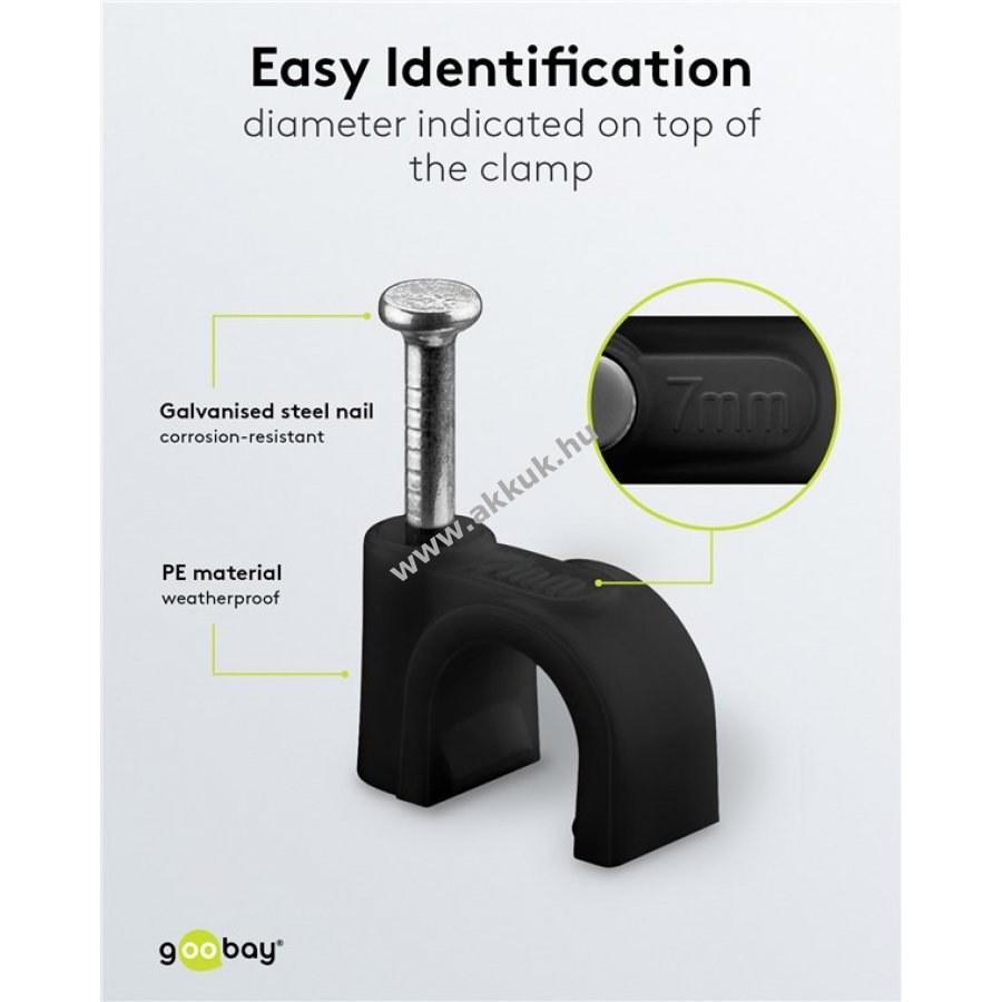 Kábelrendező bilincs max 7 mm átmérőjű kábelekhez falra ajtókerethez és sarkokhoz. Stabilizált PE műanyagból és cinkezett acél szeggel készült. Beltéri és kültéri használatra alkalmas jó szigeteléssel korrózió- és öregedésálló.