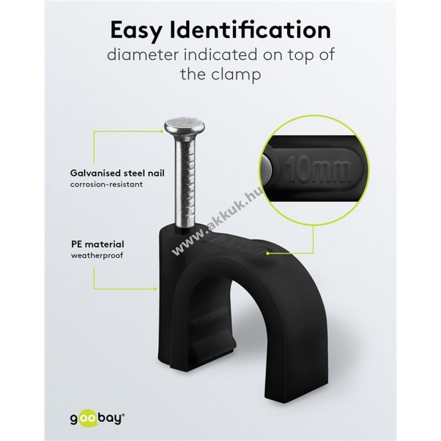 Kábelrögzítő 10 mm átmérőjű kábelekhez falra ajtókerethez és sarkokhoz. Stabilizált PE műanyagból és horganyzott acél szeggel készült. Beltéri és kültéri használatra alkalmas jó szigeteléssel korrózió- és öregedésálló.