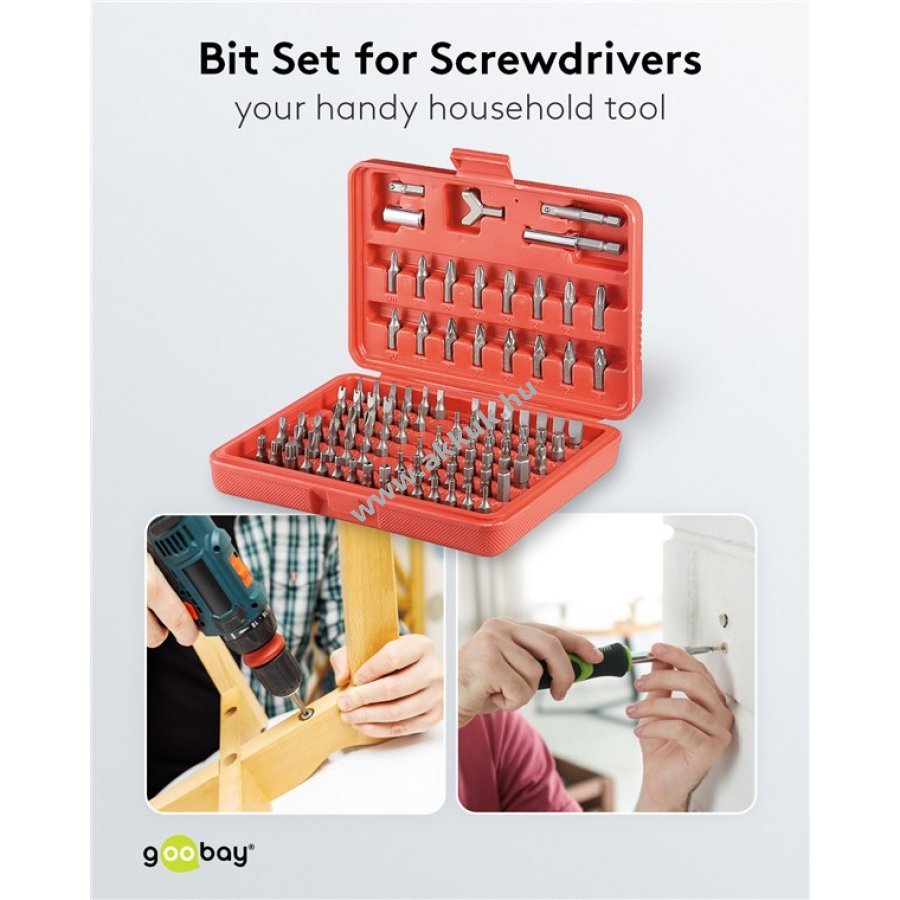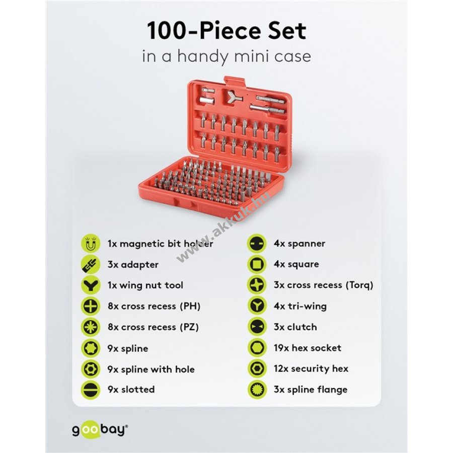 Bitválaszték: 8x Phillips (PH) 8x Pozidriv (PZ) 4x négyszög 3x Torx kereszt 9x lapos 4x spanner 9x ékprofil 9x ékprofil tüske 4x Tri-Wing 3x Clutch 19x belső hatszög 3x soklapú 12x belső hatszög tüske