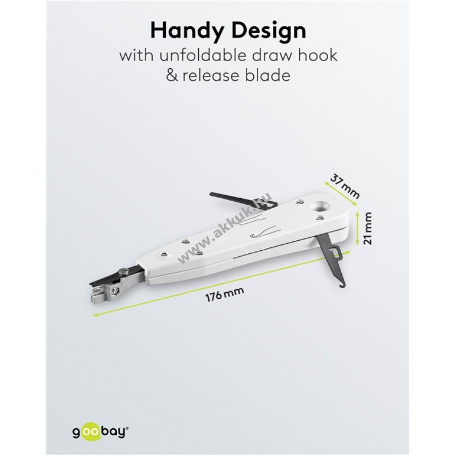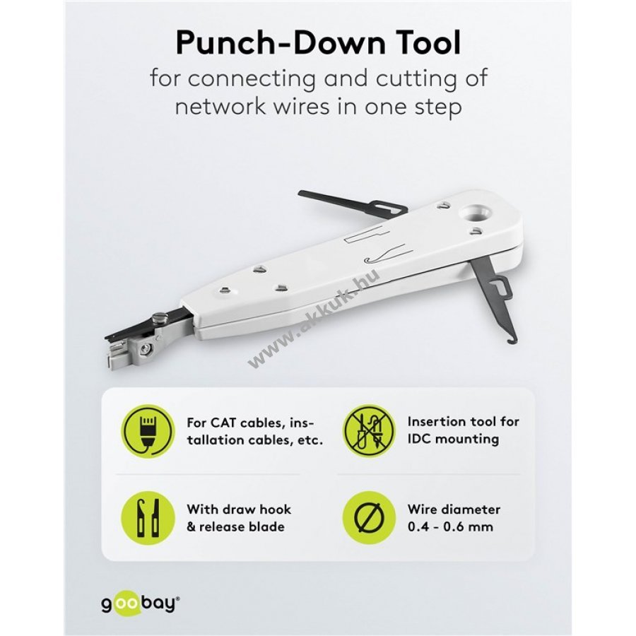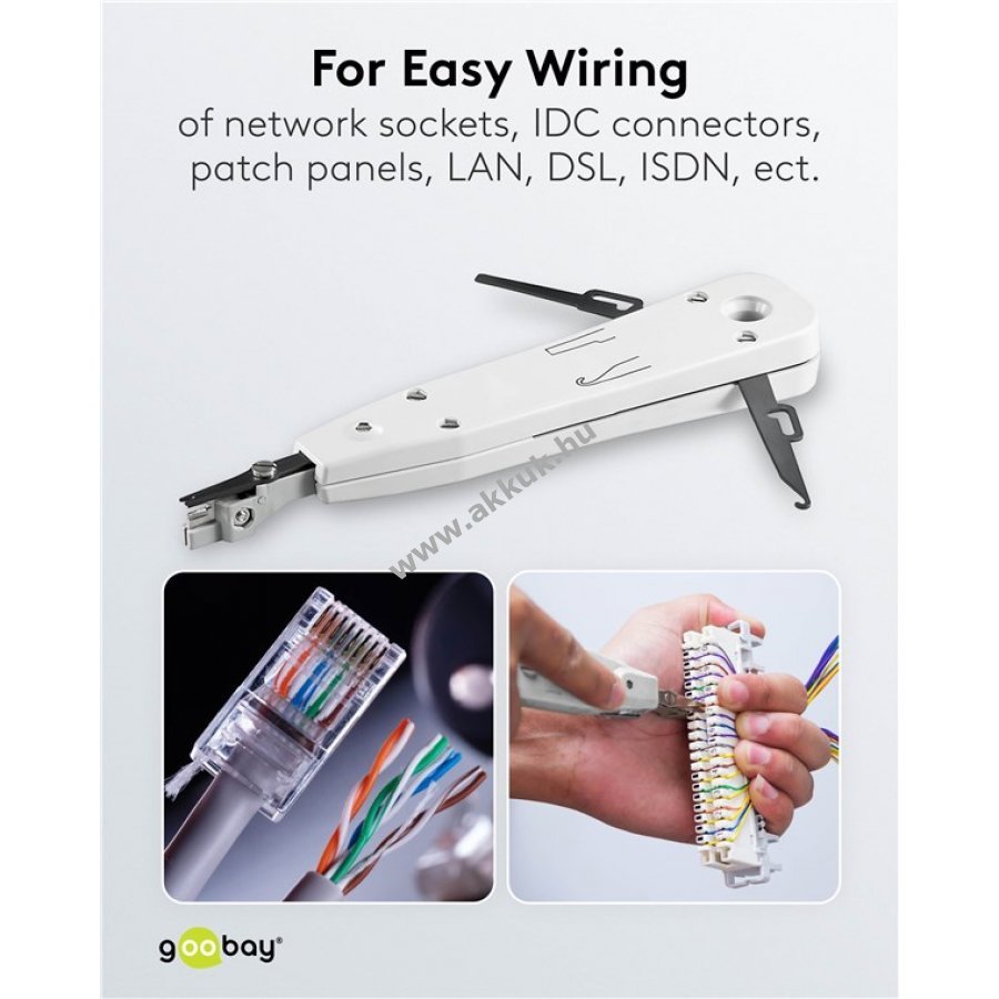Praktikus eszköz LSA vezetékek rögzítéséhez hálózati aljzatokban és patchpanelekben. Alkalmas RJ45 LAN DSL ISDN és TAE kábelekhez. A forrasztás és csavarozás nélküli LSA technológia egyszerű csatlakoztatást tesz lehetővé. A felesleges vezetékvégek automatikusan levágódnak. Beépített kampók segítik a hibás vagy előzőleg telepített vezetékek eltávolítását a kapocslétről anélkül hogy a szomszédos vezetékek megsérülnének. Univerzális használat minden hálózati kábelezéshez például felületre vagy fal alá szerelt dobozokban patchpanel vagy telepítőkábel esetén.