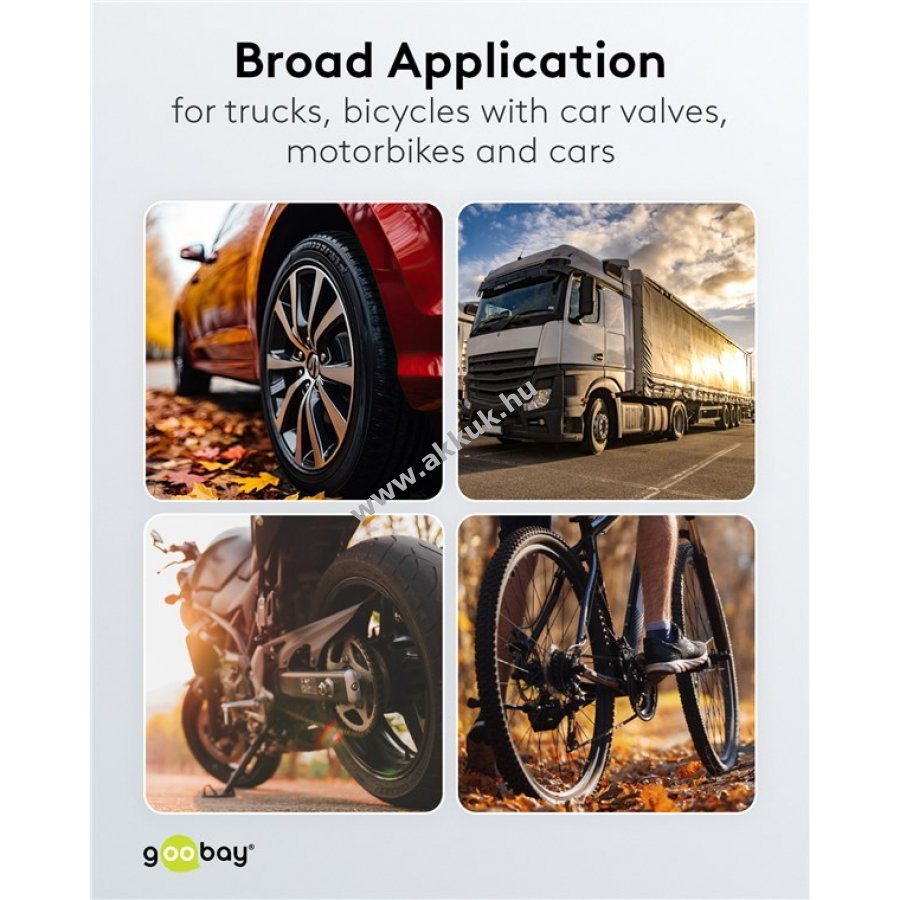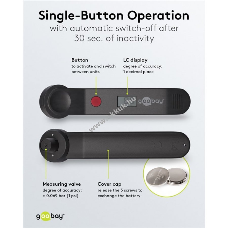 A rendszeres légnyomás ellenőrzés növeli a közlekedésbiztonságot és segít az üzemanyag megtakarításban. Pontos gumiabroncs nyomás kijelzés több egységben PSI Bar KPA Kg/cm. Digitális kijelző a könnyű és pontos leolvasáshoz. Alkalmas teherautók kerékpárok autószelepes motorok és autók számára. Automatikus kikapcsolás 30 másodperc inaktivitás után. Egyszerű egygombos kezelés.