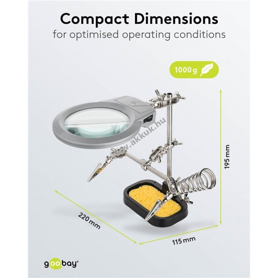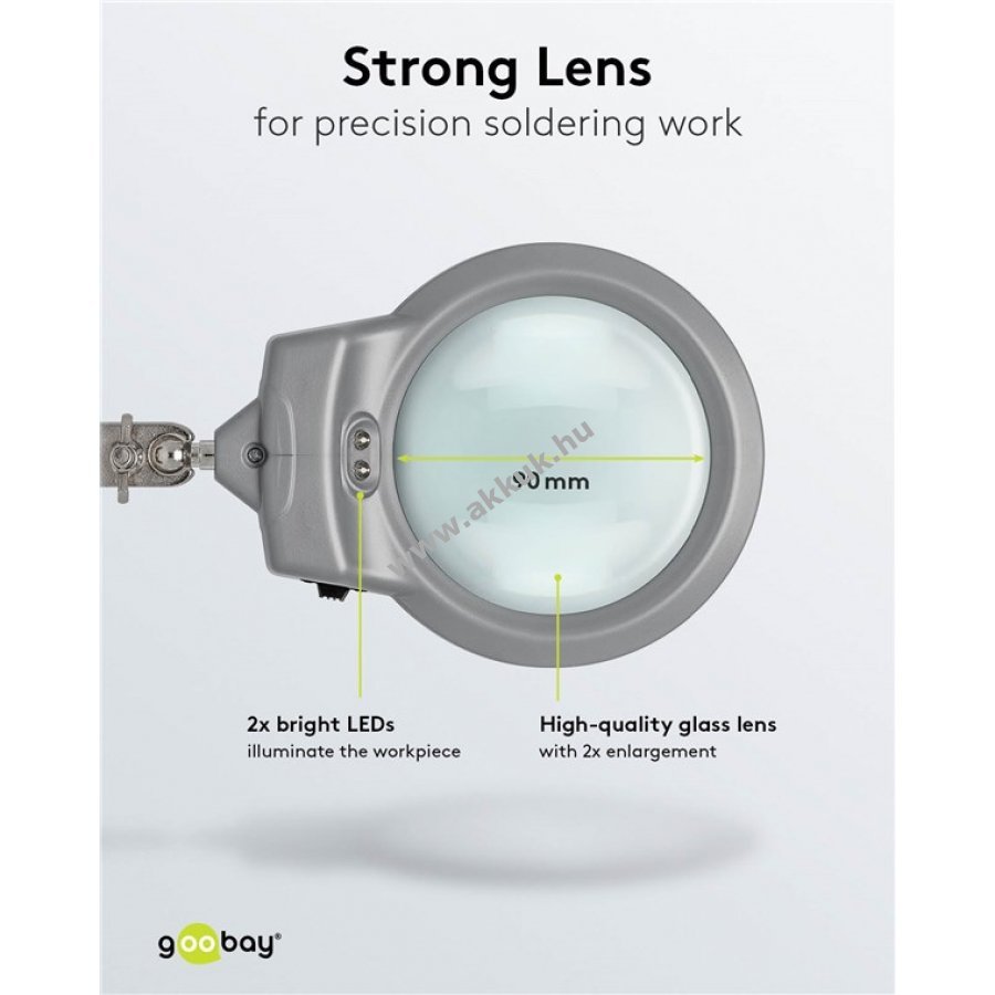 A kézi munka és a precizitás találkozása. A nagyítóval és LED világítással minden apró részlet jól látható. A fém érintkezős krokodilcsipeszek biztonságosan rögzítik a munkadarabot és szabaddá teszik a kezeket a pontos munkához. Ezáltal a precíziós munkák egyszerűbbek és hibamentesebbek.