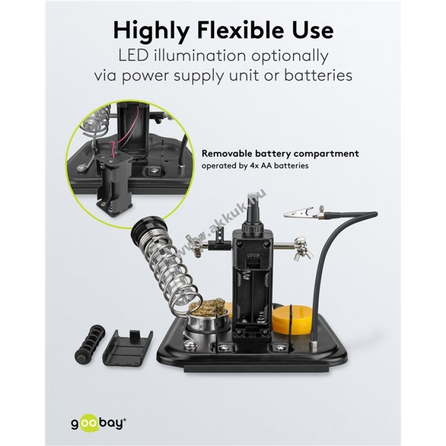 Tartozékok: beépített forrasztóón tartó, forrasztópáka tartó, 3 krokodilcsipesz, forrasztószivacs, tisztító gyapot és fluxus. A réz forrasztóhegy tisztító hatékonyan eltávolítja a szennyeződéseket és megakadályozza a rozsdásodást. A szivacs a felesleges forrasztóanyagot tisztítja, száraz állapotban szállítva, vízzel érintkezve megduzzad. Használható hálózatról Eurocsatlakozóval vagy 4 db AA elemmel (elemek nélkül).