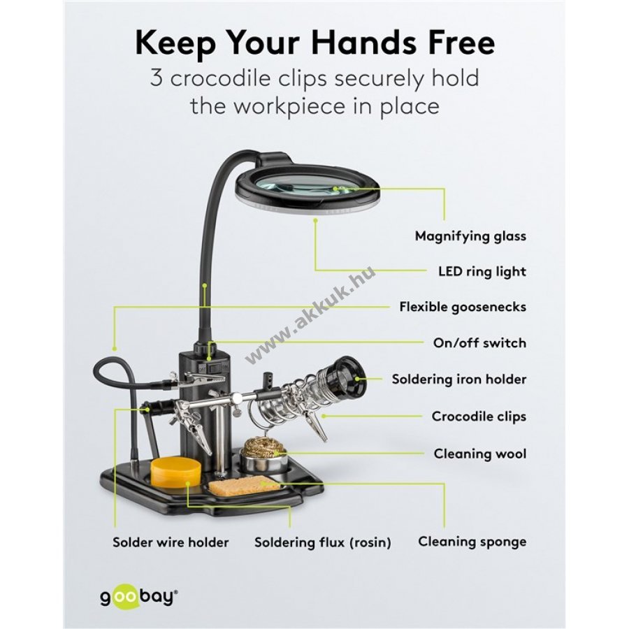 Segítség precíz forrasztáshoz és apró kézműves munkákhoz. A nagyító 3-szoros nagyítást és 16 LED-es világítást biztosít a részletekhez. A krokodilcsipeszek stabilan rögzítik a munkadarabot és szabadon hagyják a kezeket. A karos kialakítás mindkét eszköznél állítható, így bármilyen szögből dolgozhat. Ideális elektronikai alkatrészekhez, modellépítéshez, kézművességhez és ékszerjavításhoz.