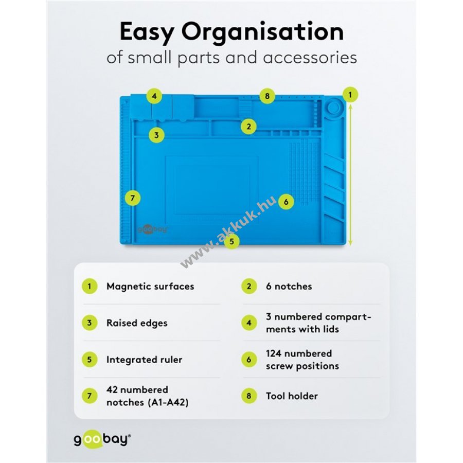 Négy mágneses felület és hat praktikus tárolóvájat valamint megemelt peremek megakadályozzák a kis alkatrészek mint csavarok vagy csavarhúzók elmozdulását