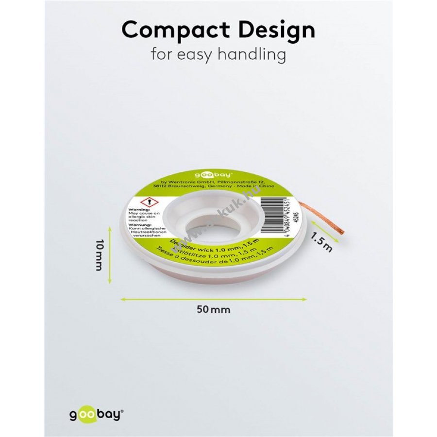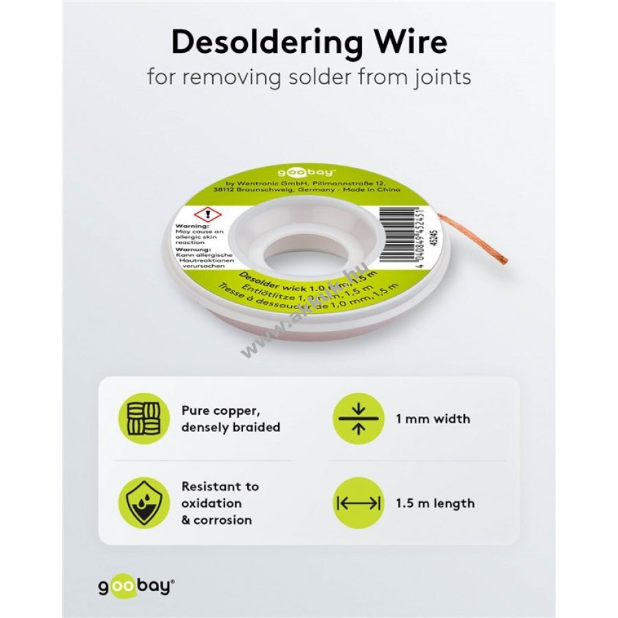 Tiszta rézből készült ónszívó szál, oxidáció- és korrózióálló, jó hővezető képességgel.