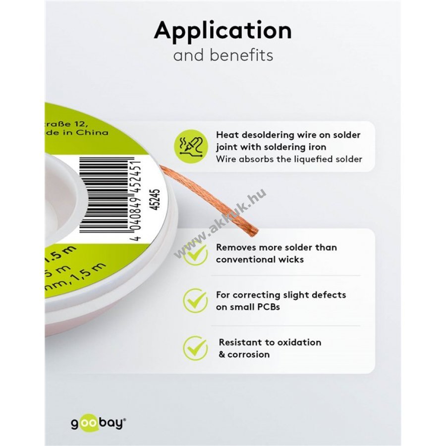 Nagy kapilláris hatásának köszönhetően hatékonyan és tisztán távolítja el az olvadt forrasztóónt.