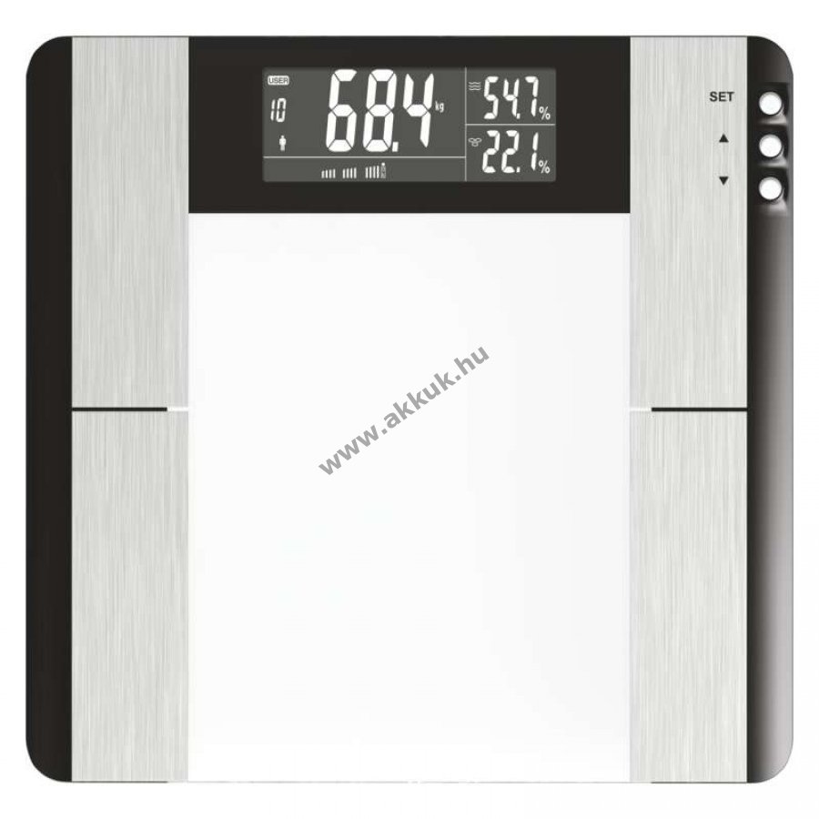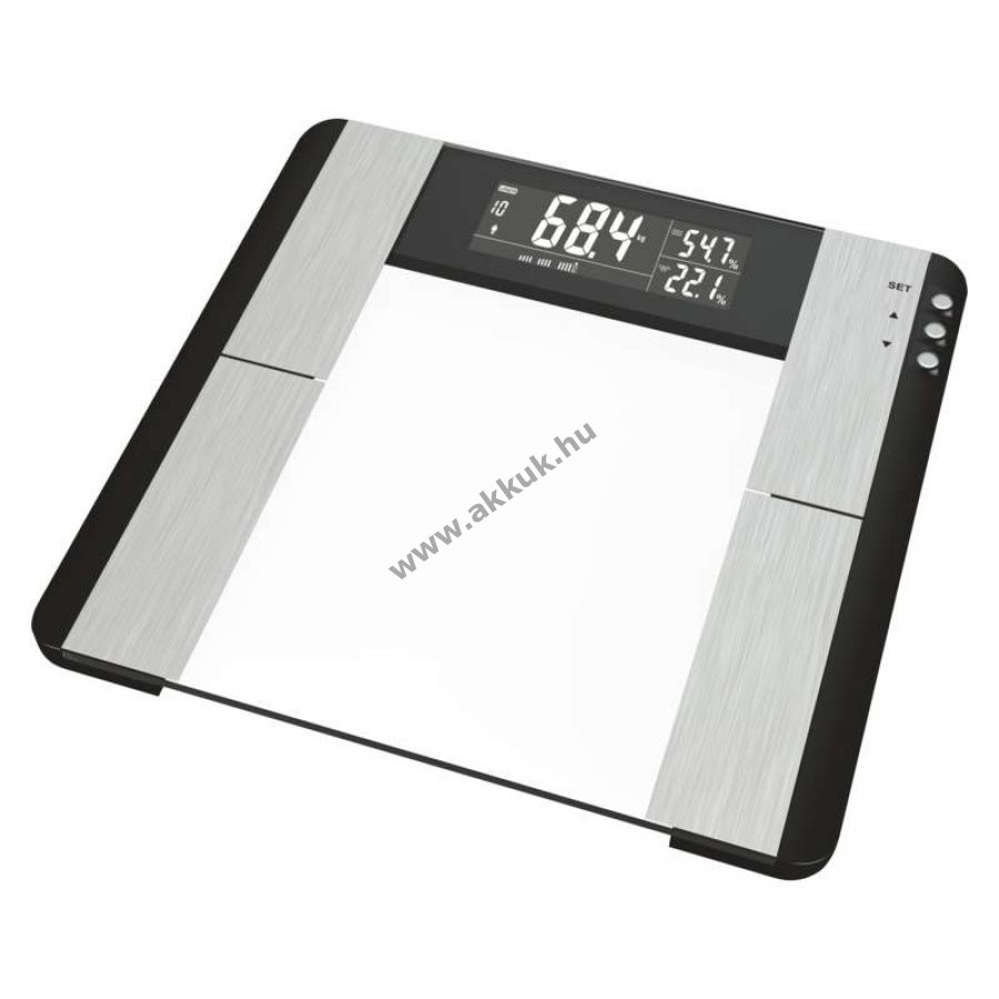 zsír, víz és izom mérése - mérleg felső része edzett üveg, -súlymérési pontosság 100g, -automata kikapcsolás 35 másodperc után, -lemerülő elem jelzése, -maximális terhelhetoség: 150kg, memória max 10fő, -mértékegységek: kg, lb, St, -tápellátás: 2x1,5V AAA, -méretek (sz x ma x mé): 20mm x 320mm x 330 mm